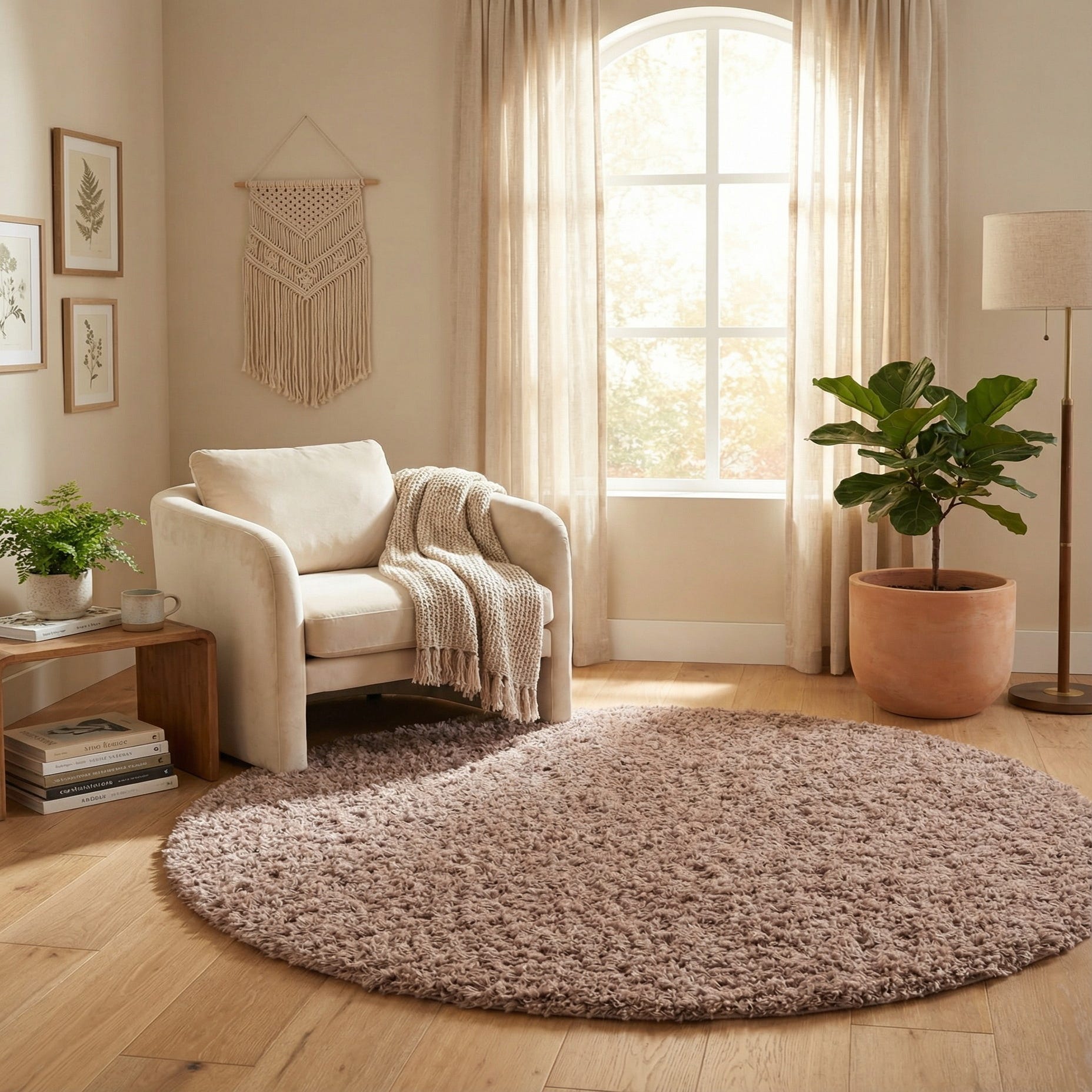 A deep, high-loft shag in a warm khaki tone gives this round rug a simple, tactile presence. The surface is uniformly textured rather than patterned, with densely packed polyester fibers that create subtle tonal variation and a soft, slightly lustrous finish. Running your hand across the pile you’ll feel a cushiony, spring-back quality that highlights the plush, shaggy construction.