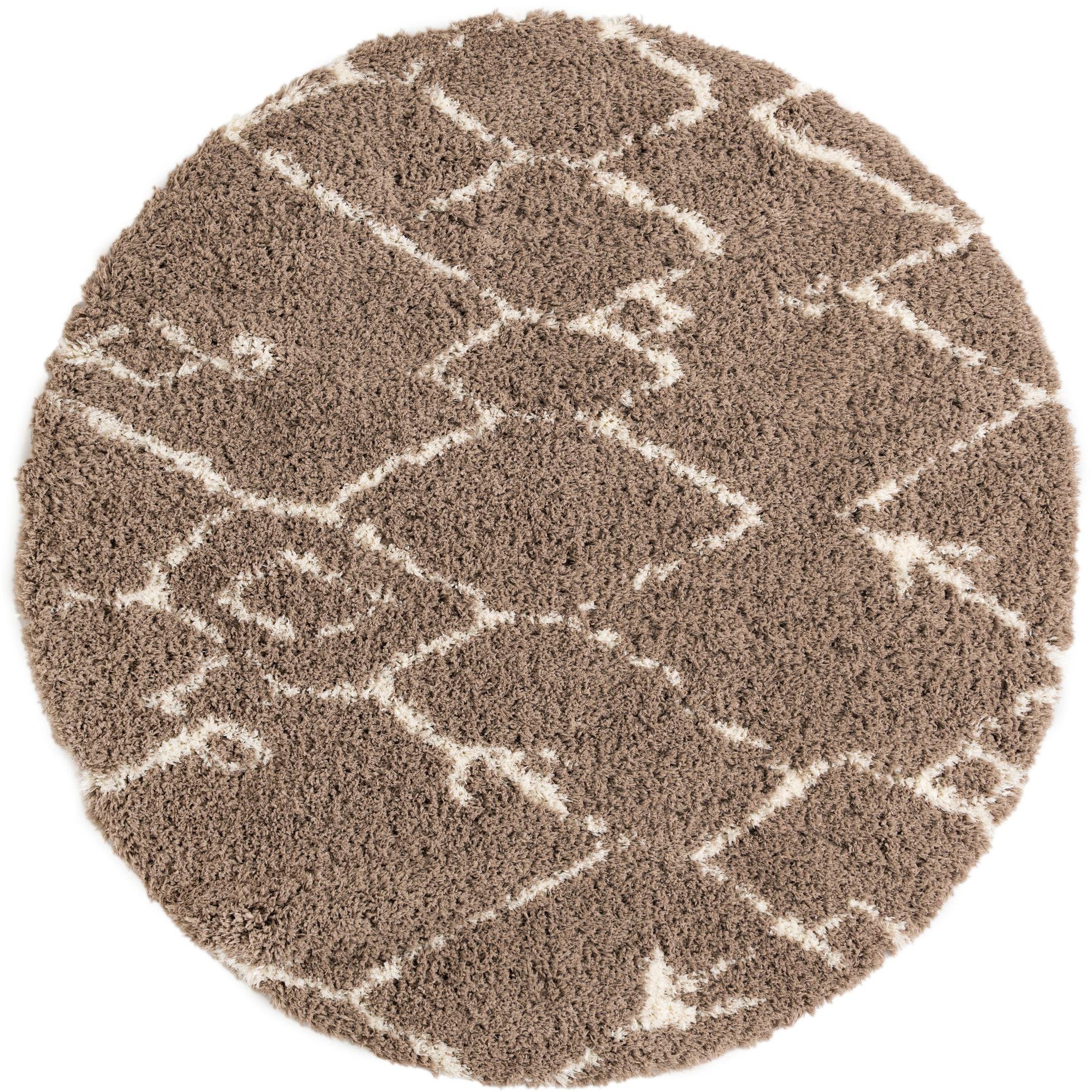 A round brown shag rug with an abstract ivory geometric pattern, perfect for adding modern comfort to any indoor space.