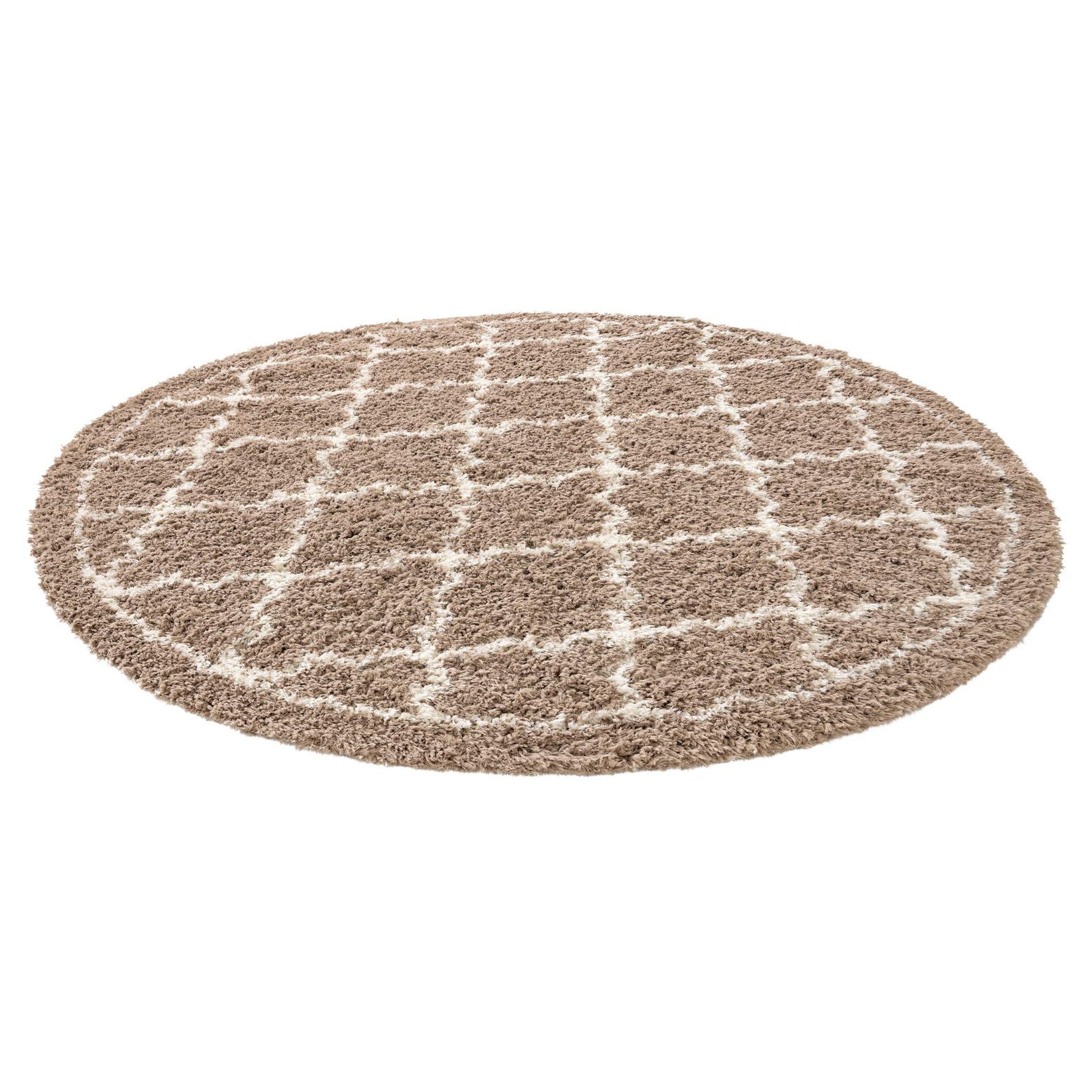 A round brown shag rug with an ivory modern geometric trellis pattern, suitable for a living room or bedroom.