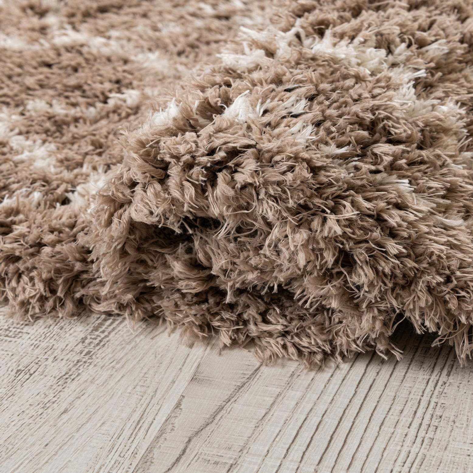 A round brown shag rug with an ivory modern geometric trellis pattern, suitable for a living room or bedroom.