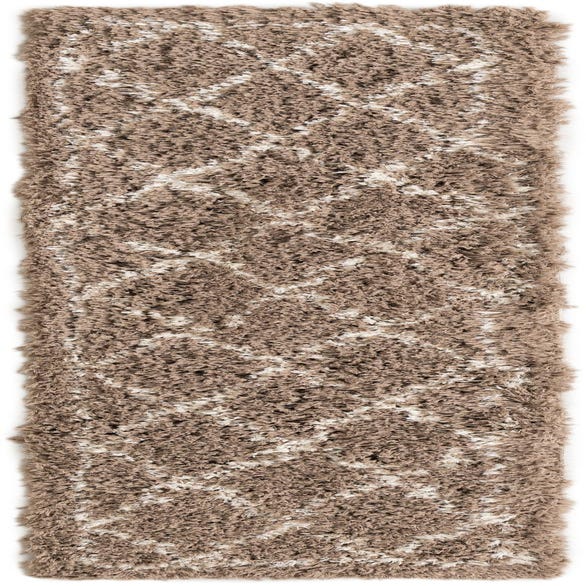 A long, rectangular 8 ft runner rug with a thick brown shag pile and an abstract ivory modern pattern.