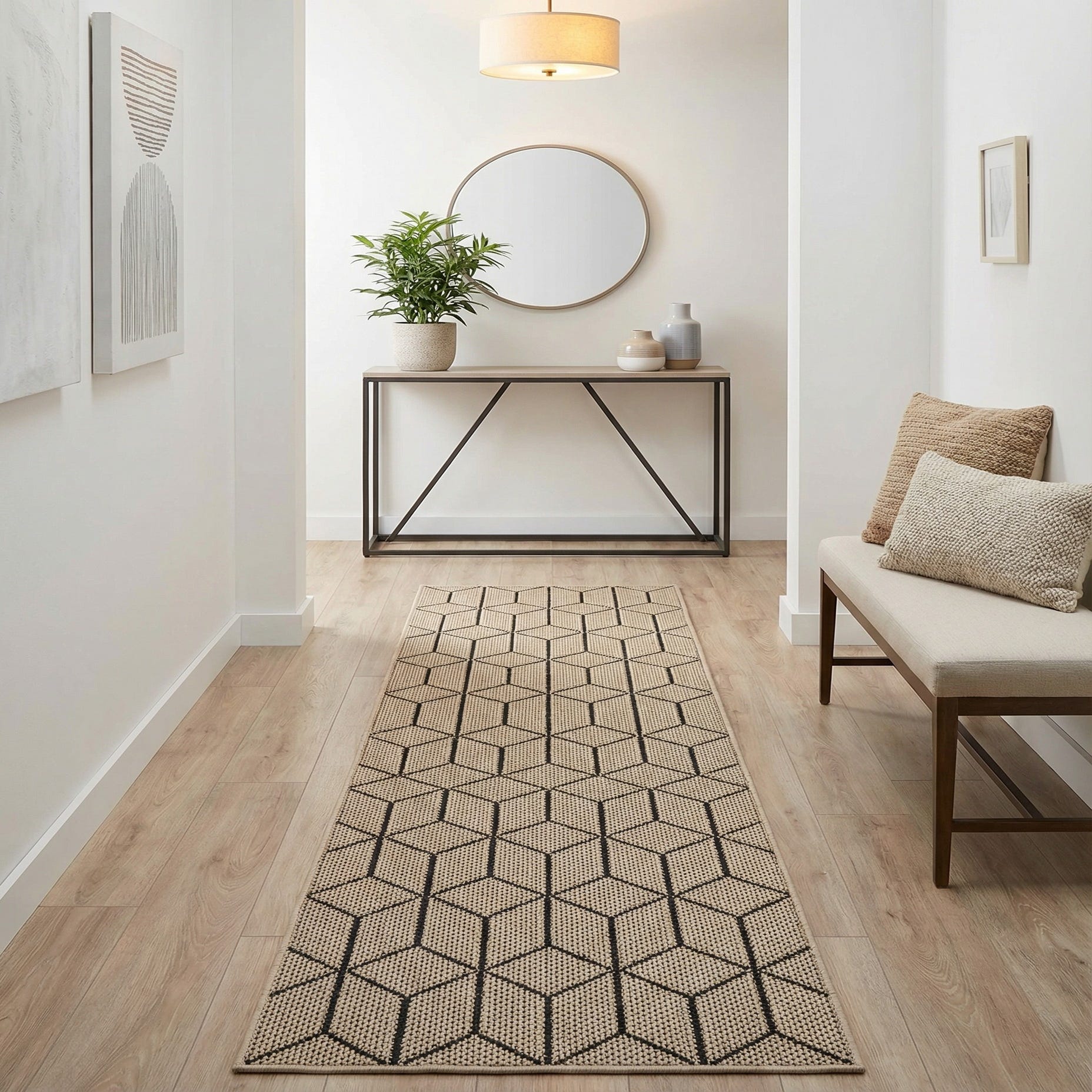 Ideal for high-traffic areas, this runner could proficiently serve as a stylish connector in hallways, kitchens, or covered patios. Its contemporary pattern would complement minimalist decors, accentuate industrial themes, or provide a counterpoint to more traditional settings. Whether used to extend a welcome in an entryway or to add definition in a living area, this Outdoor Lattice runner is built to gracefully withstand the elements of nature and the demands of daily life.