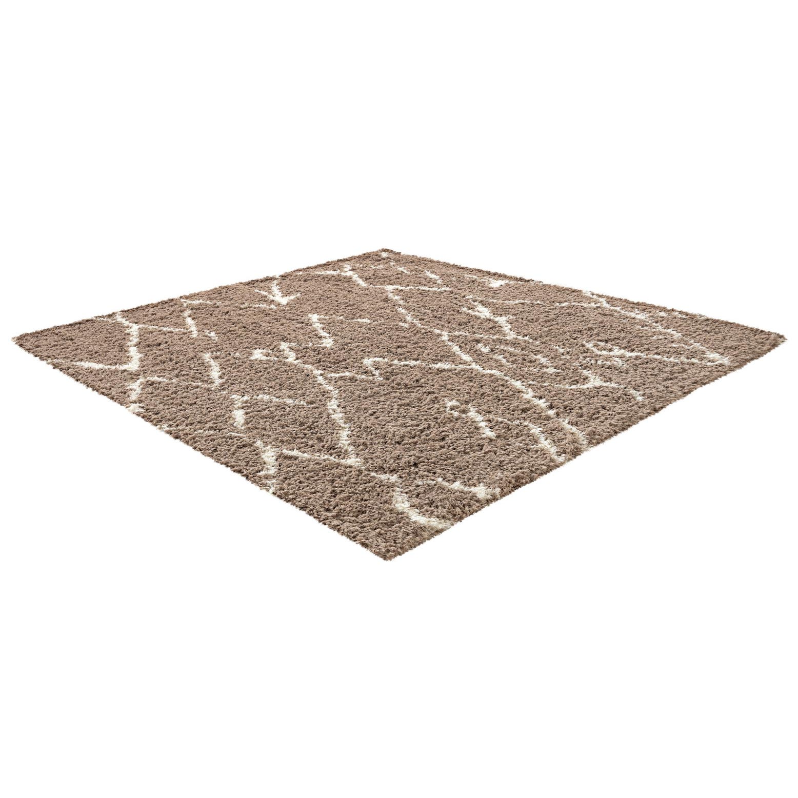 A square 8' x 8' brown shag area rug with an abstract modern ivory geometric pattern, suitable for a living room.