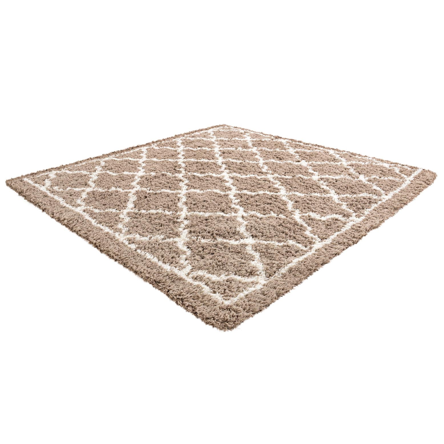 A brown and ivory square shag rug with a modern trellis pattern, shown from above.