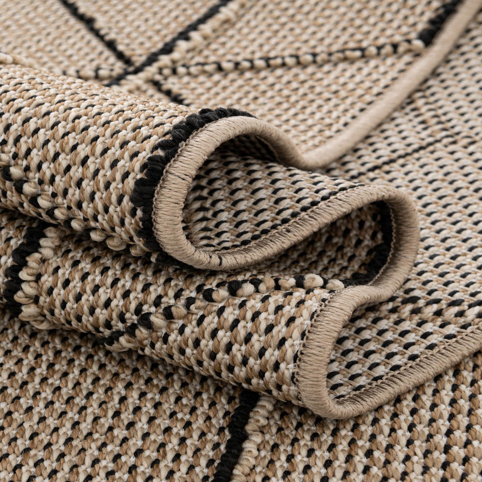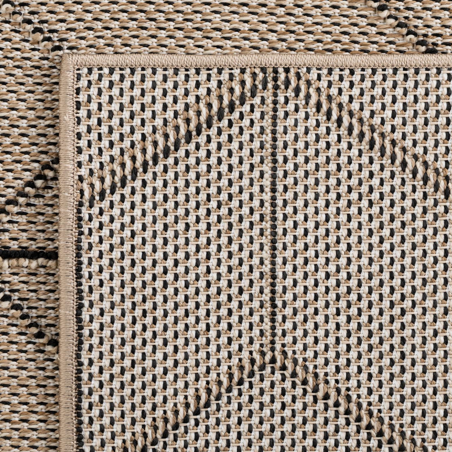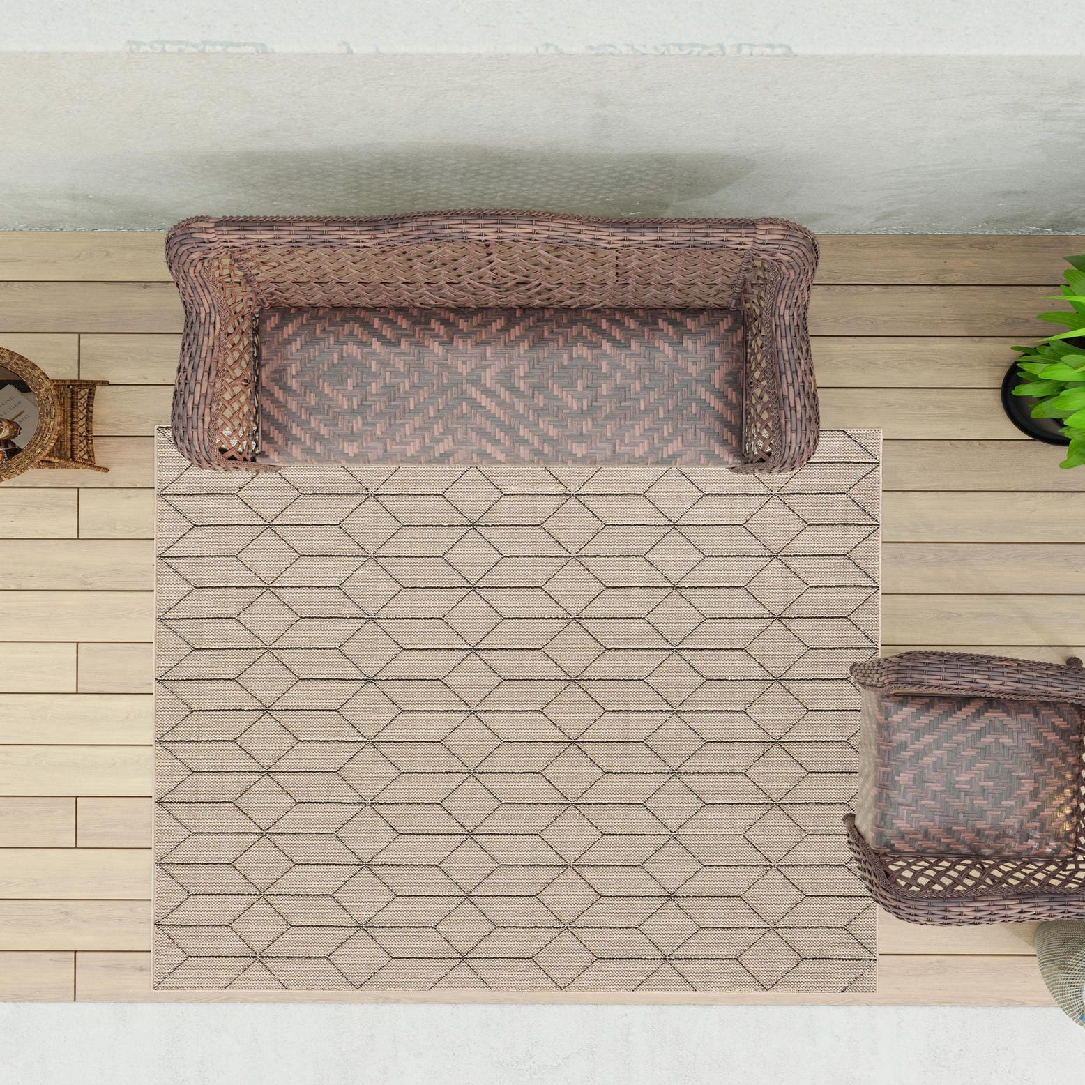 The rug's texture is suitable for outdoor settings, offering a surface that is pleasant underfoot while being robust enough to handle high foot traffic areas. This piece's clean lines and contemporary pattern make it versatile for various design scenarios. It would work exceptionally well in modern patios, decks, and sunrooms, providing a sophisticated anchor to outdoor seating areas. Additionally, its neutral color palette allows it to seamlessly integrate with minimalist, coastal, or transitional decors, making it a functional and stylish addition to any outdoor space.