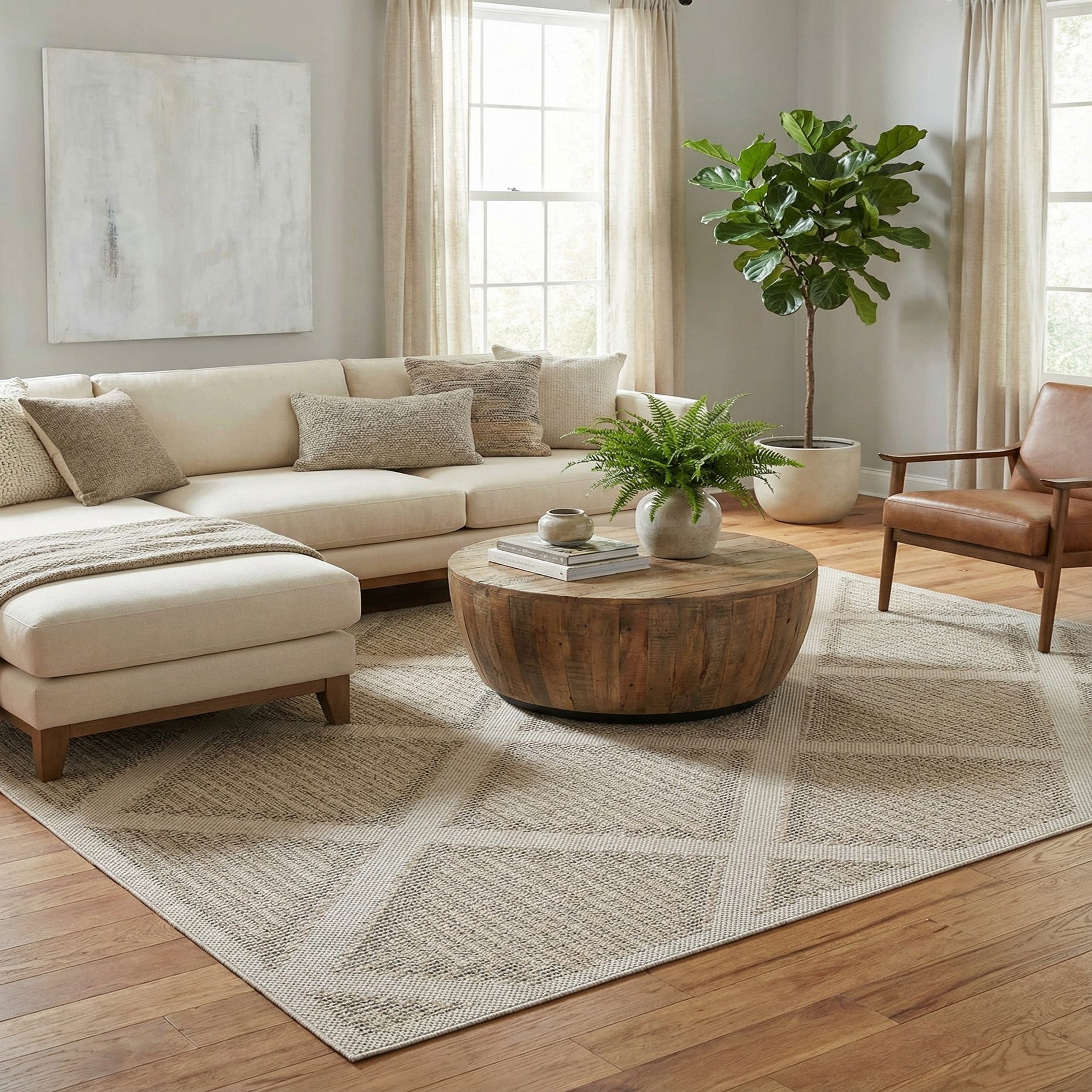 This piece works well on a covered patio or sunroom, layered beneath a bistro set or paired with wicker seating and linen cushions for relaxed, outdoor-friendly living. Indoors it complements light wood tones, neutral upholstery, and clean-lined furniture in modern coastal, farmhouse, or transitional schemes; place it in an entryway, kitchen, or living area to add visual structure without dominating the room. The khaki and beige palette pairs nicely with navy, olive, warm white, or terracotta accents for an approachable, cohesive look.