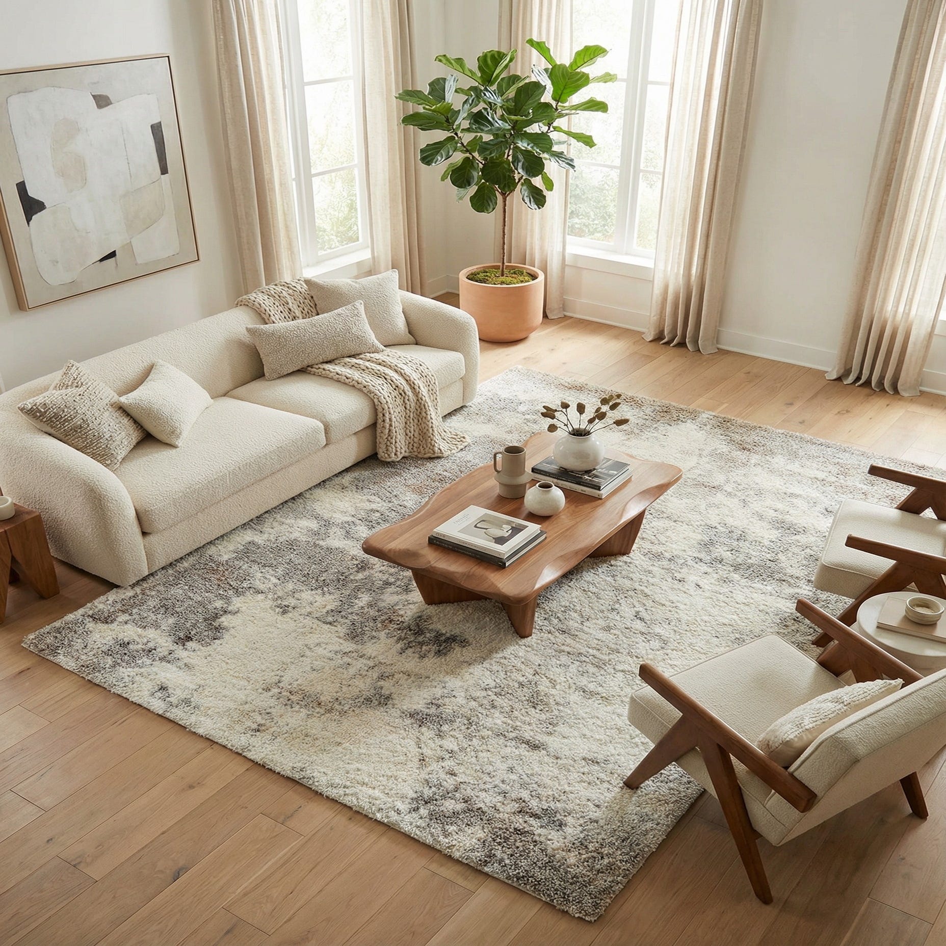 This Soft Touch Shag rug would be an ideal addition to spaces that benefit from added warmth and softness, such as living rooms, bedrooms, or cozy reading nooks. Its understated elegance pairs well with contemporary, minimalist, Scandinavian, or transitional decor, offering both visual interest and comfort. The neutral color scheme allows for flexible styling with various textures and furnishing materials, from sleek leather to rich velvet or natural woods, making it a versatile choice for an array of design scenarios.