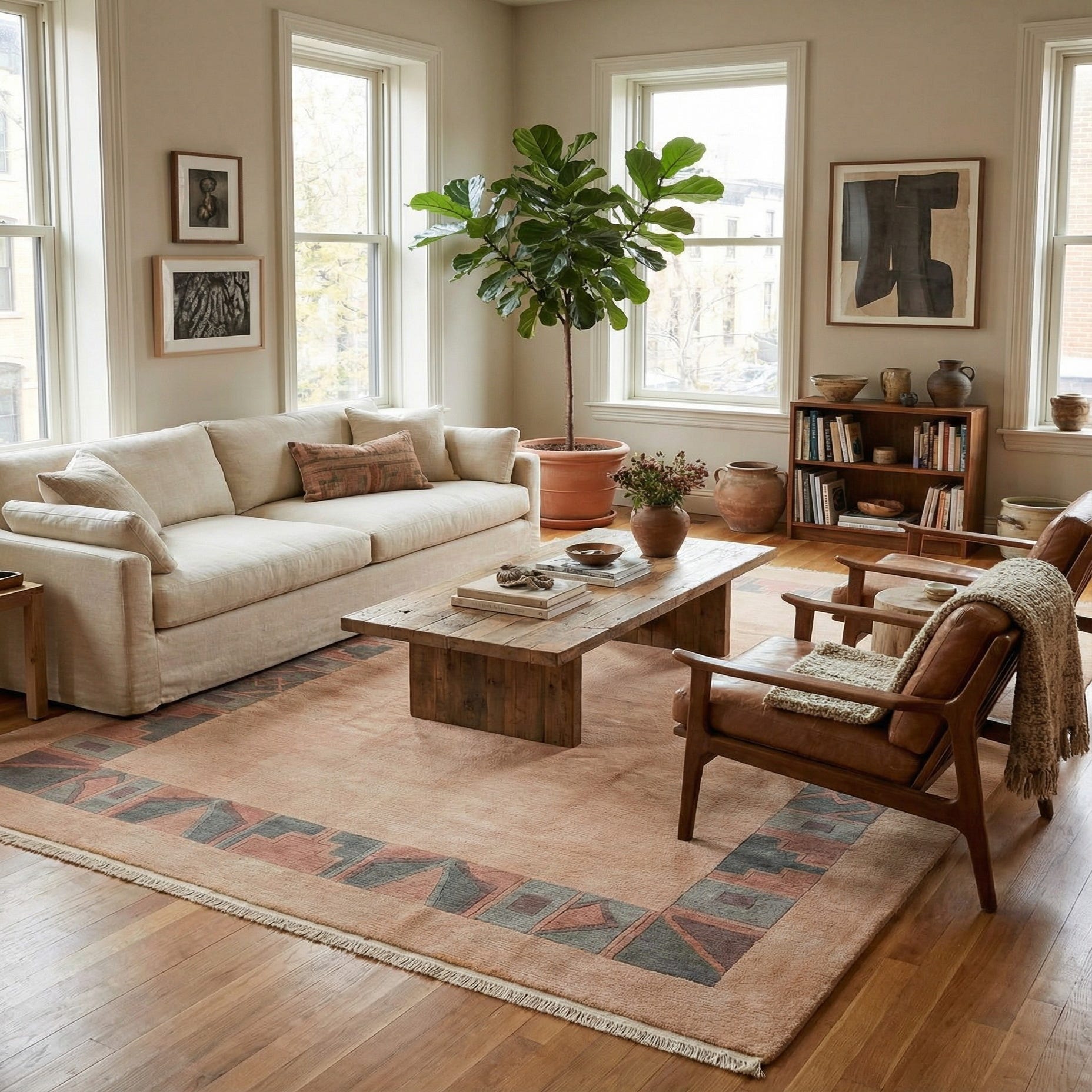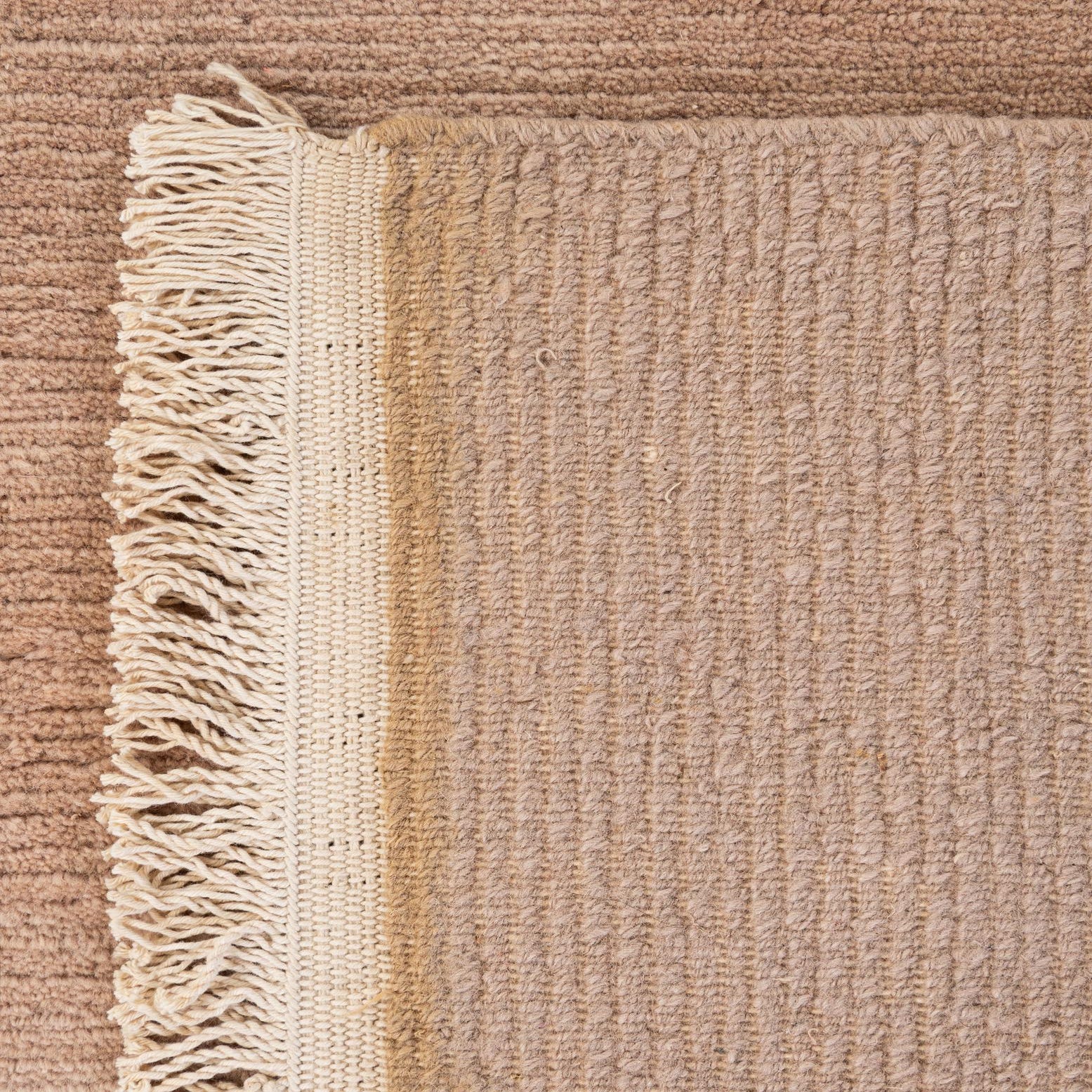 Primary color is Khaki. Colors in this rug include: Khaki, Light Blue, Navy Blue, Pink, Purple.