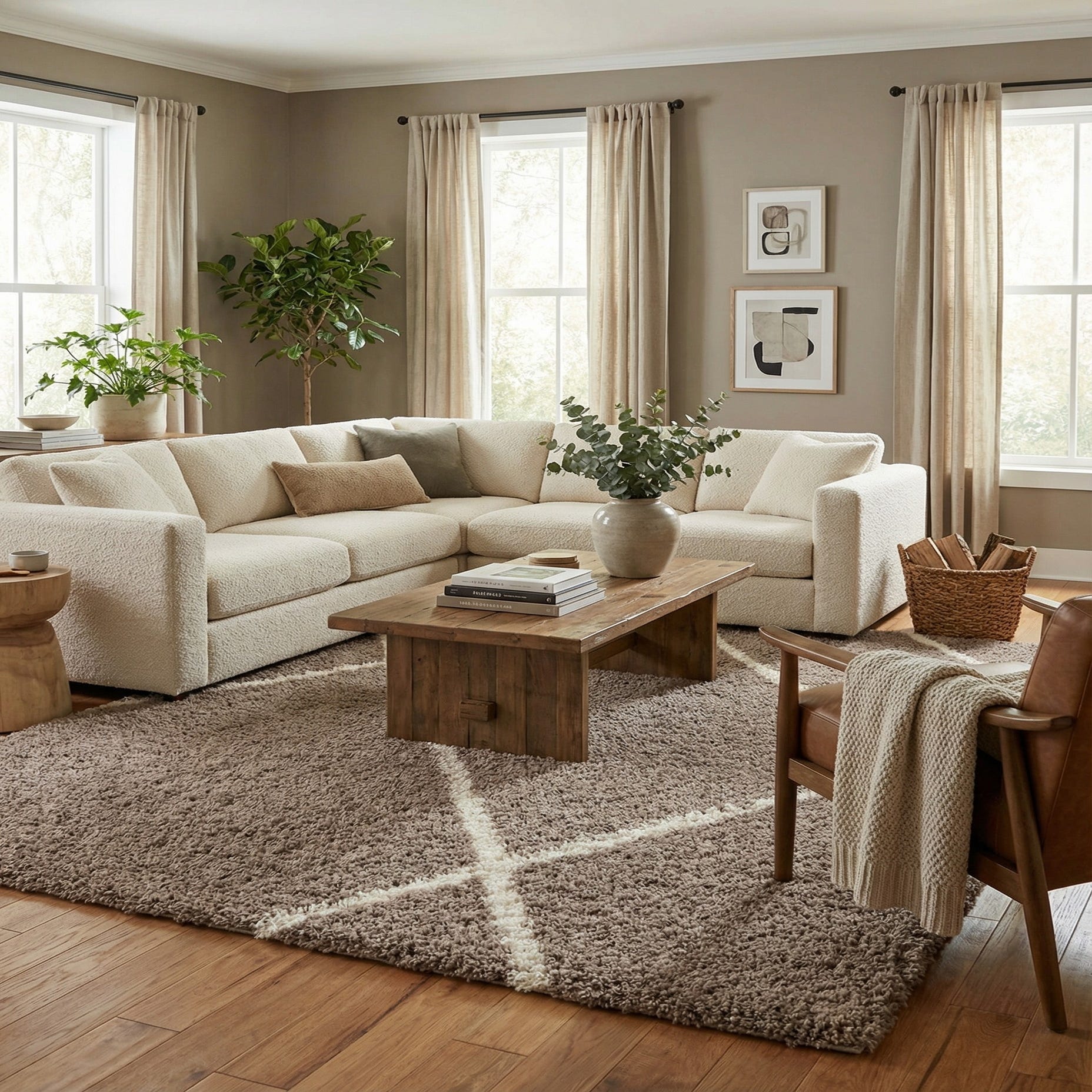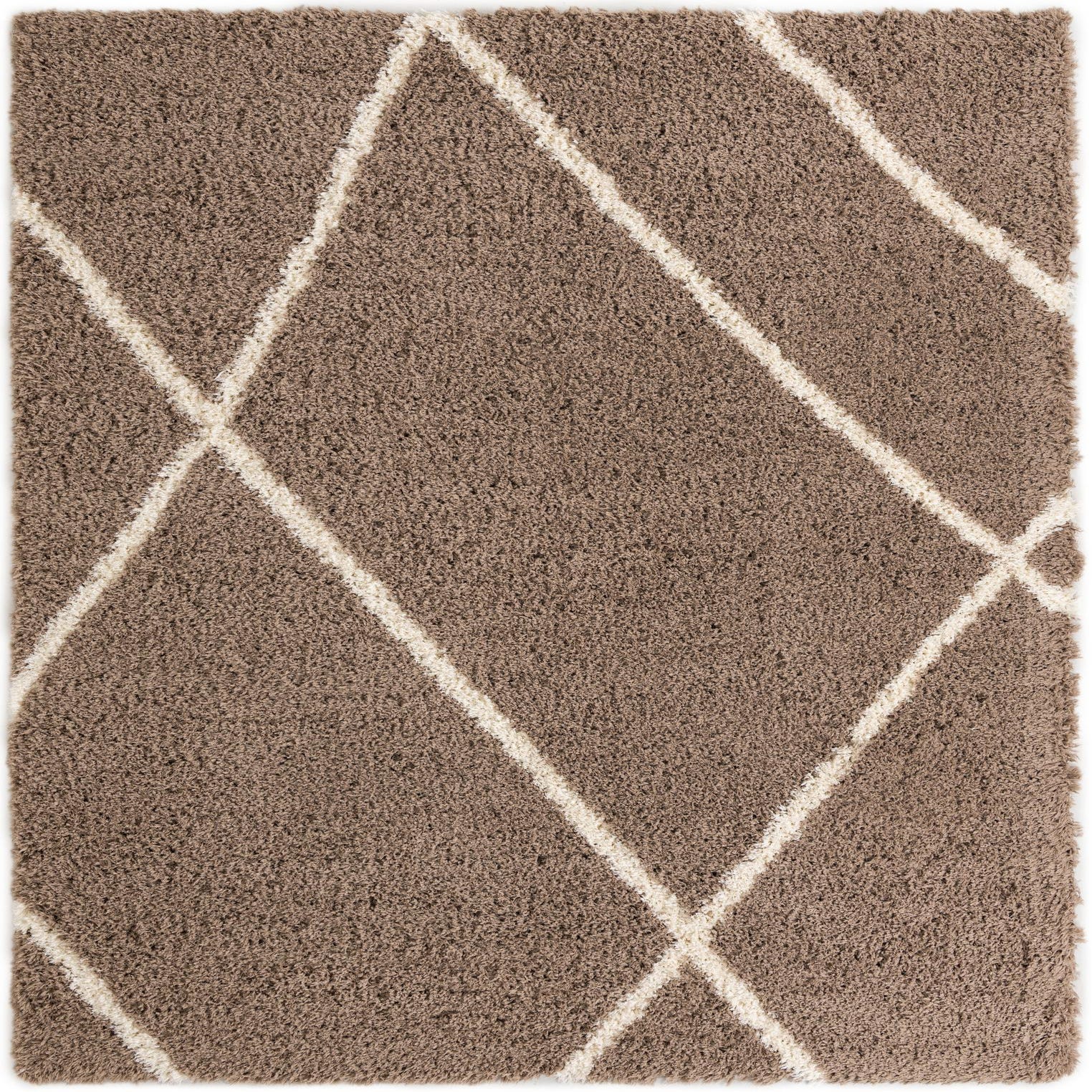A rectangular 9x12 brown shag rug with a modern ivory geometric diamond pattern, suitable for a living room.