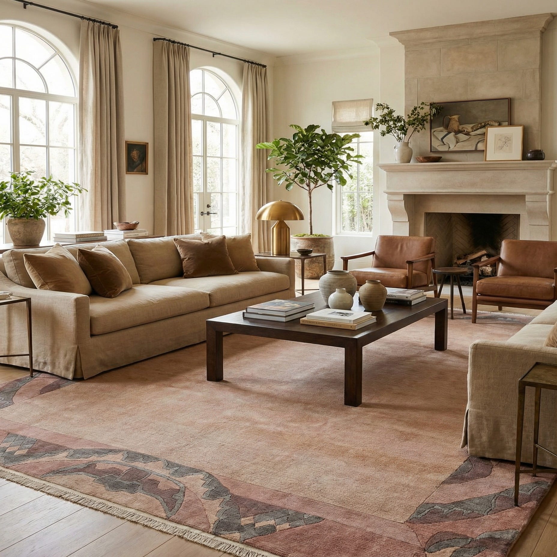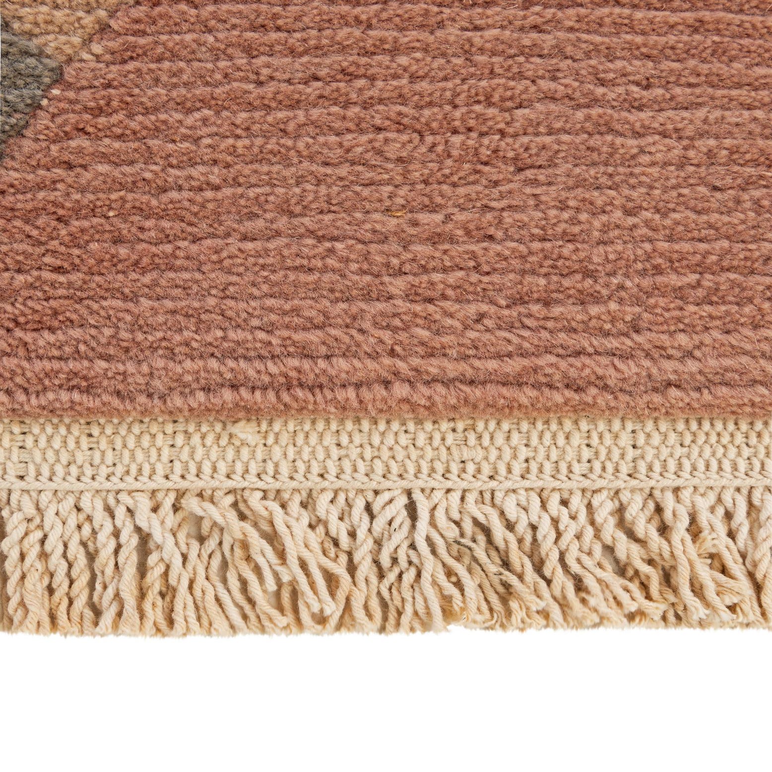 Primary color is Khaki. Colors in this rug include: Khaki, Gray, Purple, Pink, Violet.