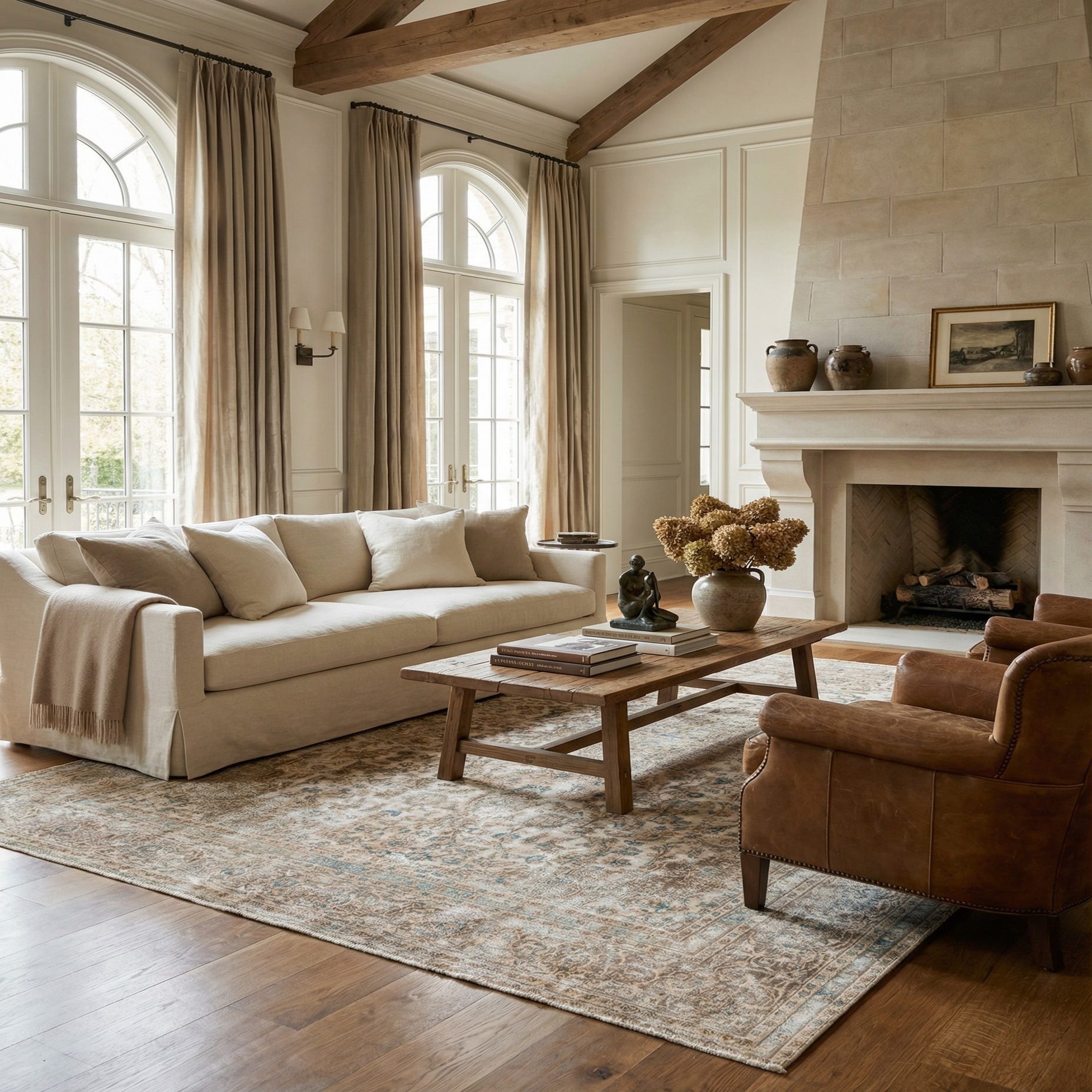A 9x12 rectangular Ultra Vintage wool rug with a distressed Persian medallion pattern in browns, tans, creams, and subtle blue accents.