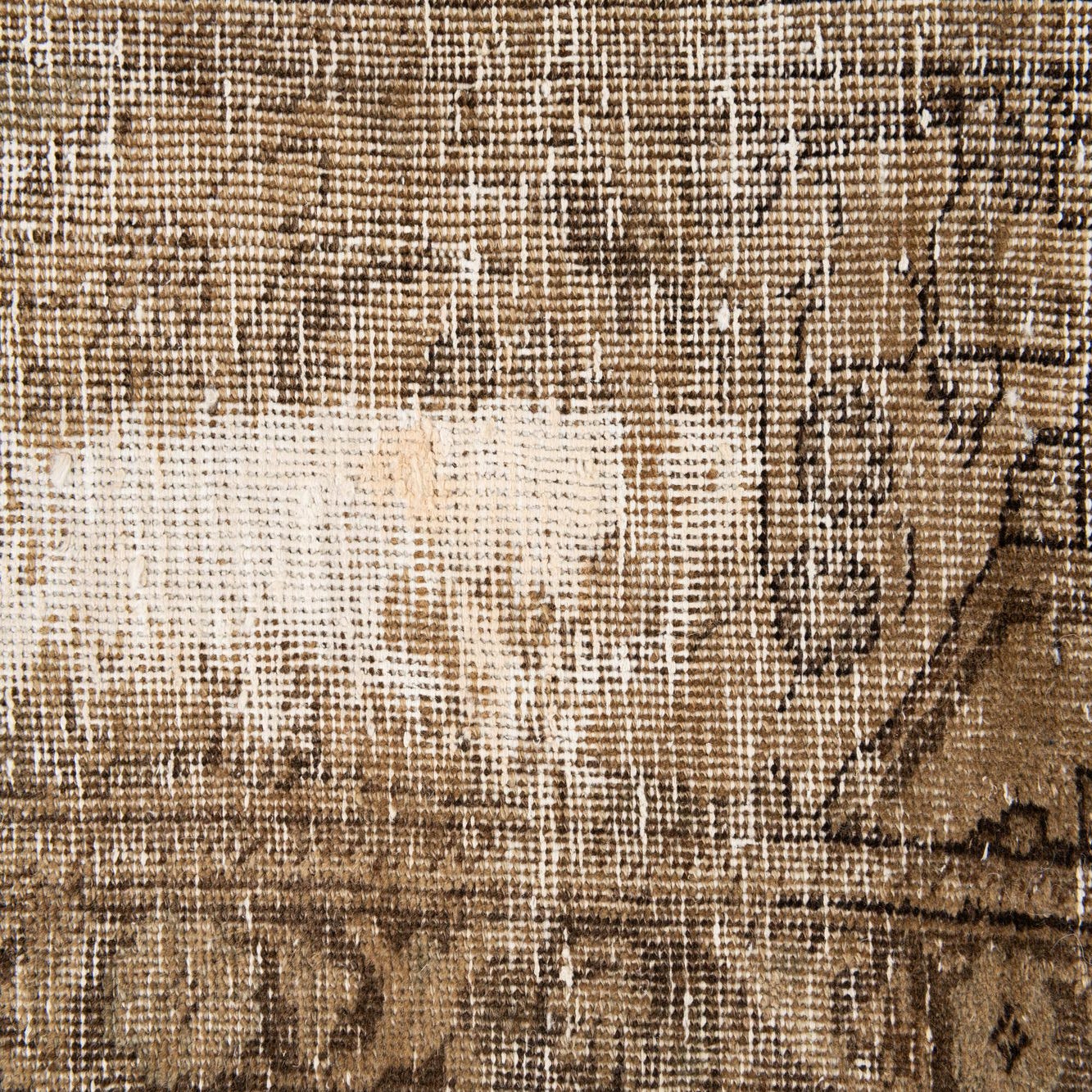 A 9x12 rectangular brown and ivory Persian-style wool rug with a distressed vintage medallion pattern, ideal for a living room.