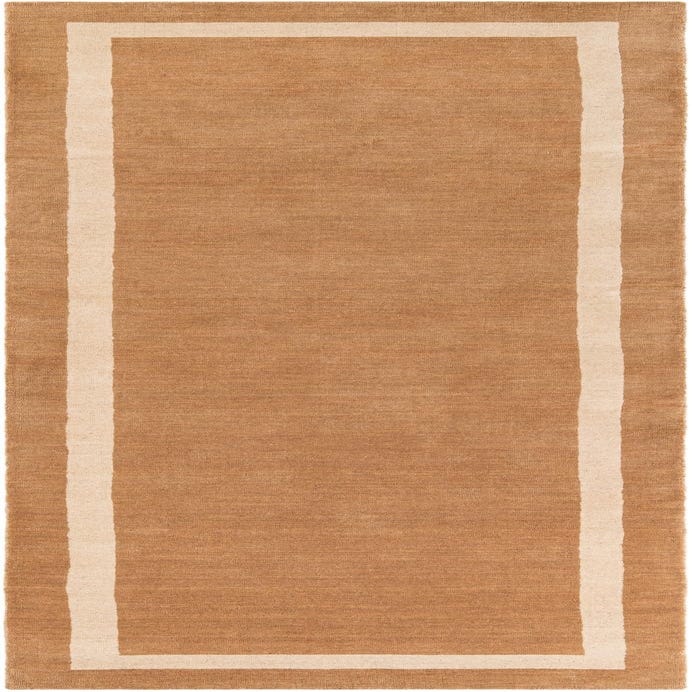 Warm latte brown fills the field of this handmade wool-and-cotton rug, where a single, soft ivory band creates a clean, architectural border. The 80% wool pile has a gentle, natural luster and subtle tonal variation from handcrafting, giving the surface depth and a soft, inviting feel underfoot, while the 20% cotton adds structure and a slightly textured weave at the edges.