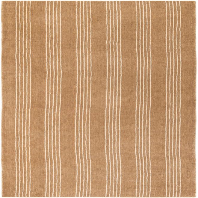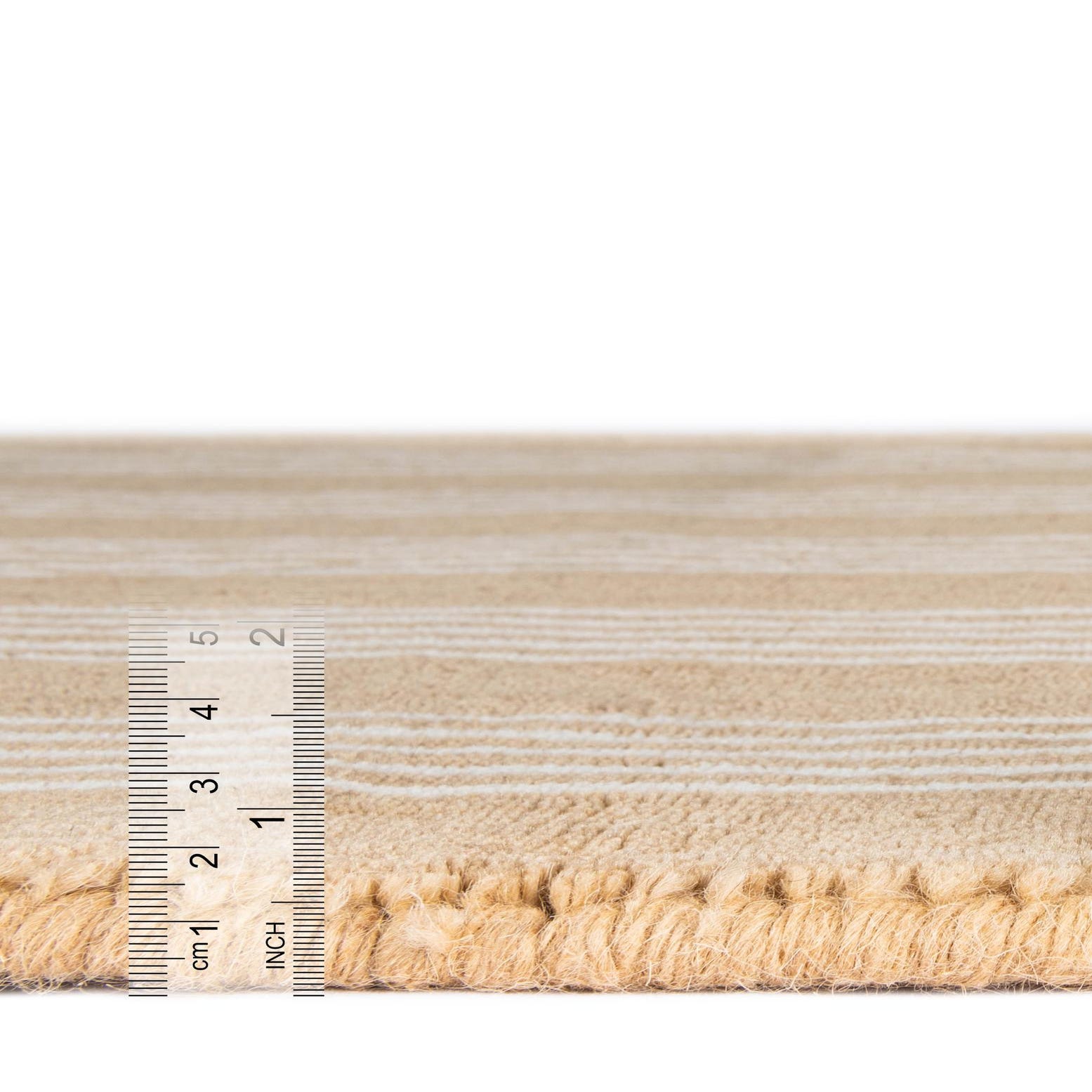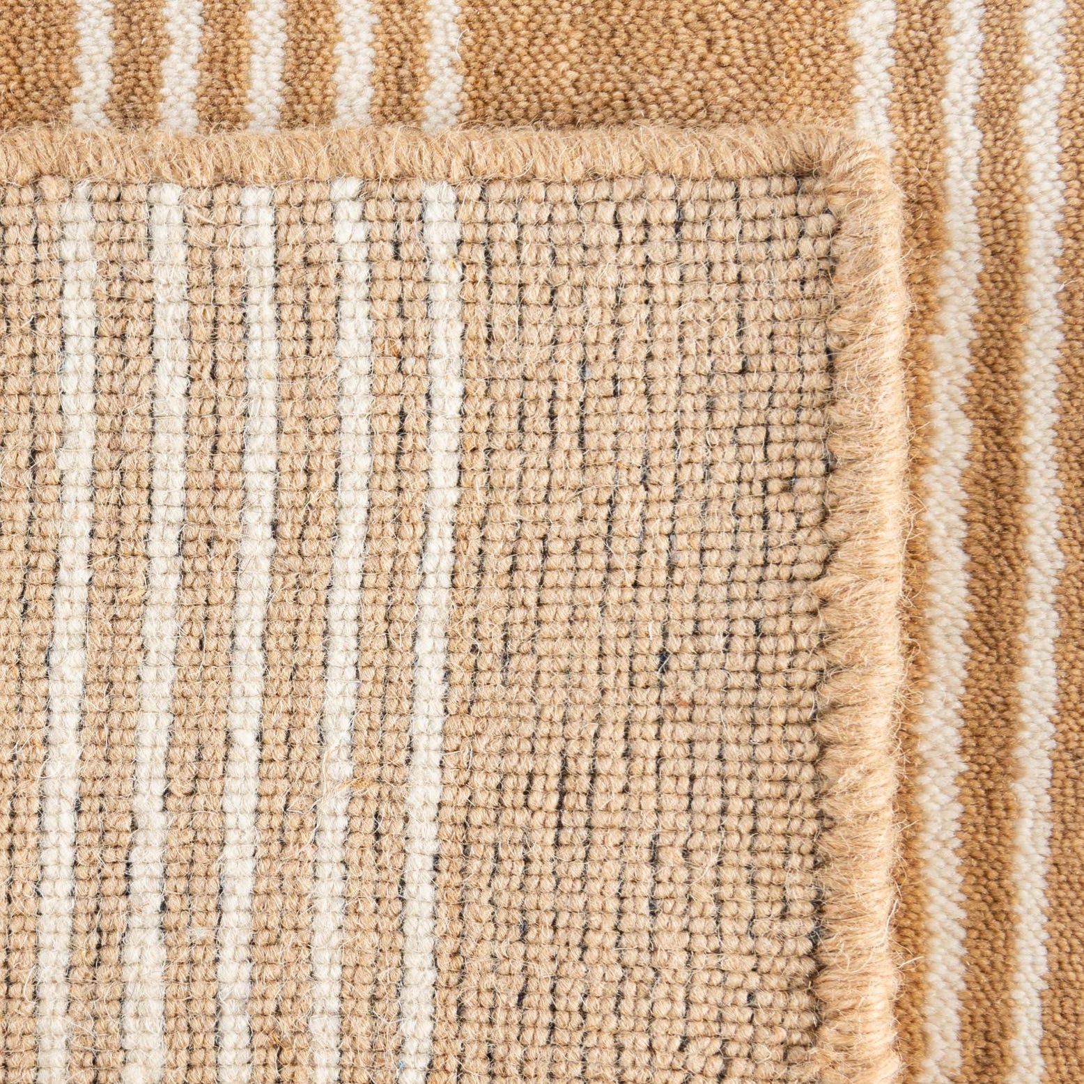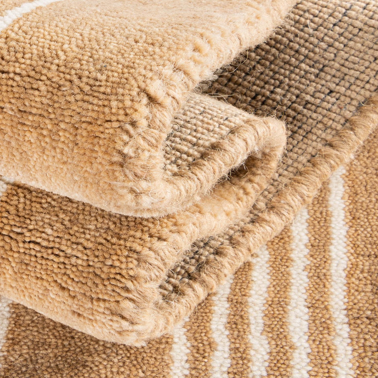 Hand-made from 80% wool and 20% cotton, this long runner has a warm latte brown ground punctuated by evenly spaced ivory pinstripes that run the length of the piece. The narrow, multi-line stripes create a clean, linear pattern that reads classic and modern at once. Underfoot the wool pile feels dense yet soft, with the cotton providing a slightly firmer foundation and a subtle, tactile surface that holds its shape.