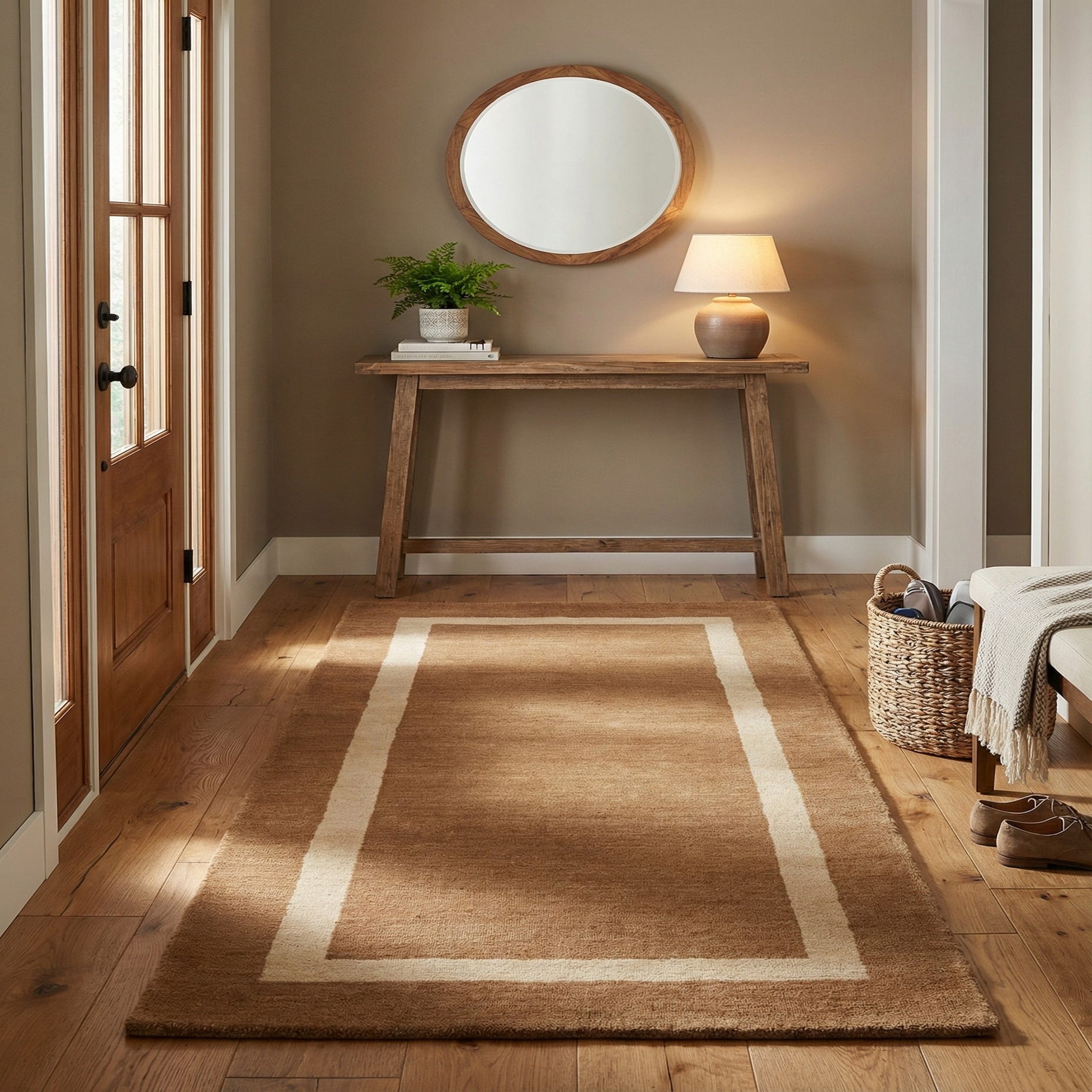A clean, understated border rug in a warm latte brown ground with a soft beige rectangular frame. The pattern is simple and geometric — a narrow inner border that defines the field and brings a quiet architectural feel. Hand made of 80% wool and 20% cotton, the surface has a low-to-medium pile with a slightly springy, warm hand; the wool provides soft texture and subtle tonal variation across the latte brown field while the cotton gives structure to the weave.