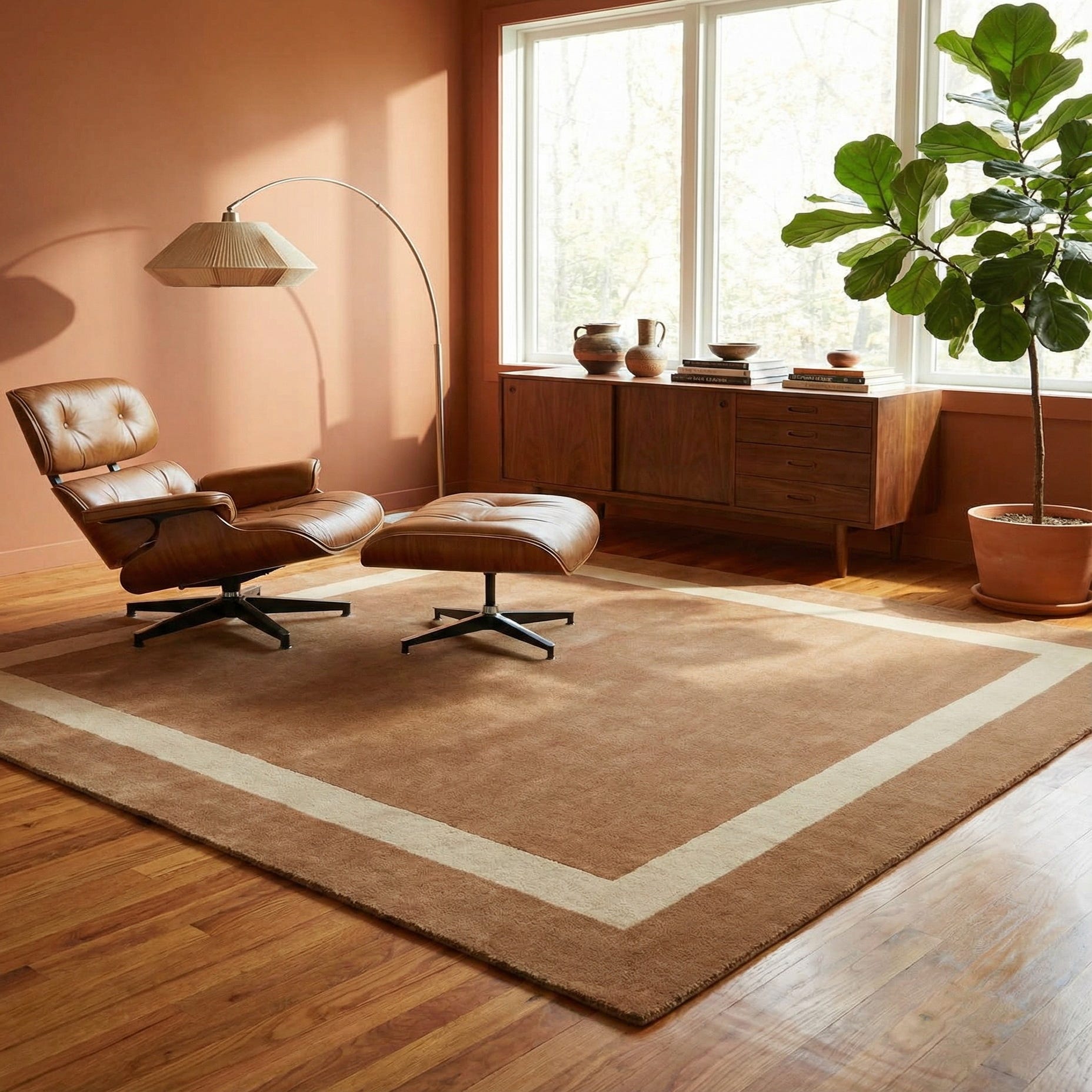 A clean, pared-back border design frames a warm latte brown background with a soft ivory band that brings subtle contrast and definition. Handmade from 80% wool and 20% cotton, the rug has a low, dense pile with a velvety surface that yields slightly to the touch and settles back when released. The muted two-tone palette and the simple rectangular border create a calm, grounded look that complements a range of interiors.