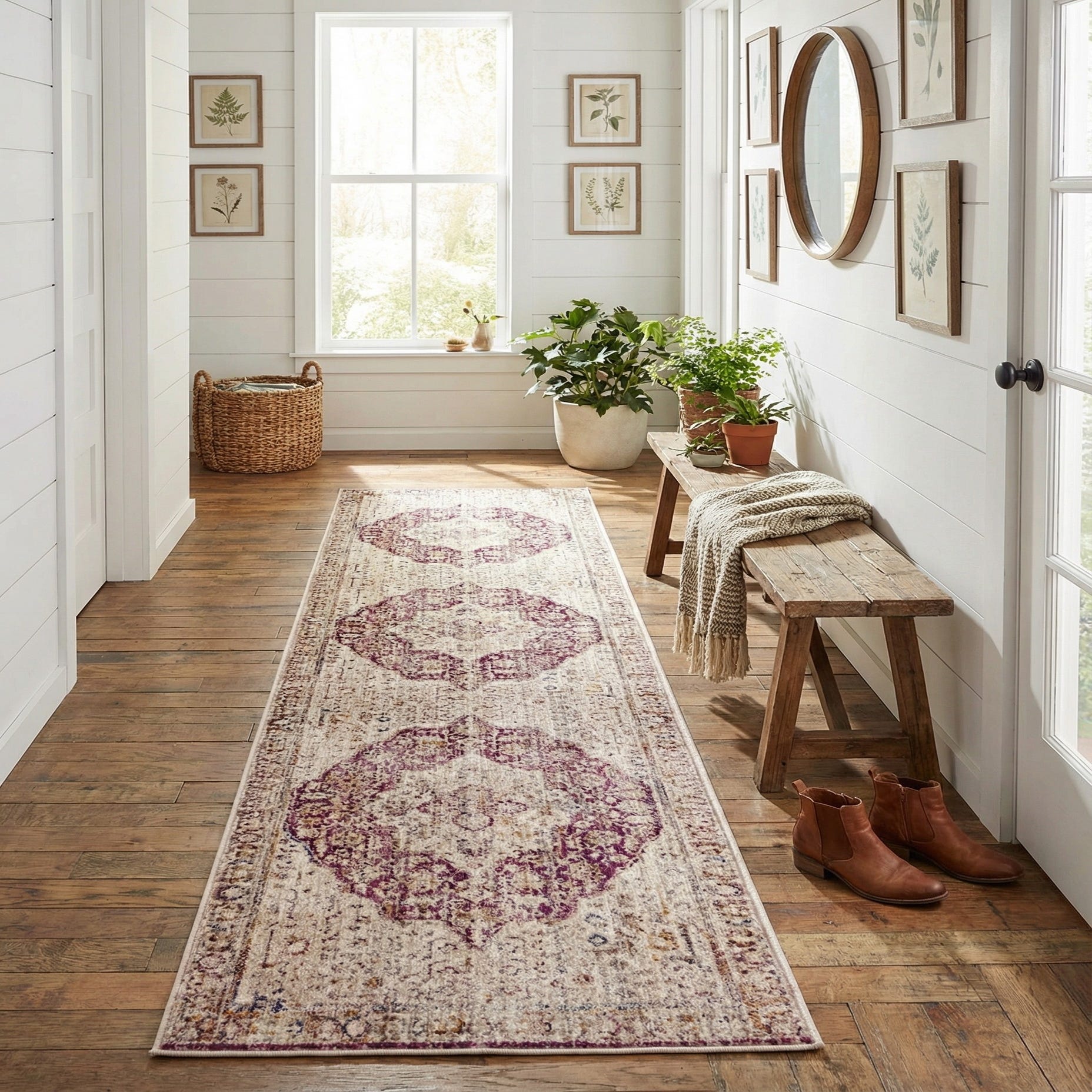 A 12 ft runner rug from the Deepa collection, featuring a distressed traditional medallion pattern in shades of purple and cream.
