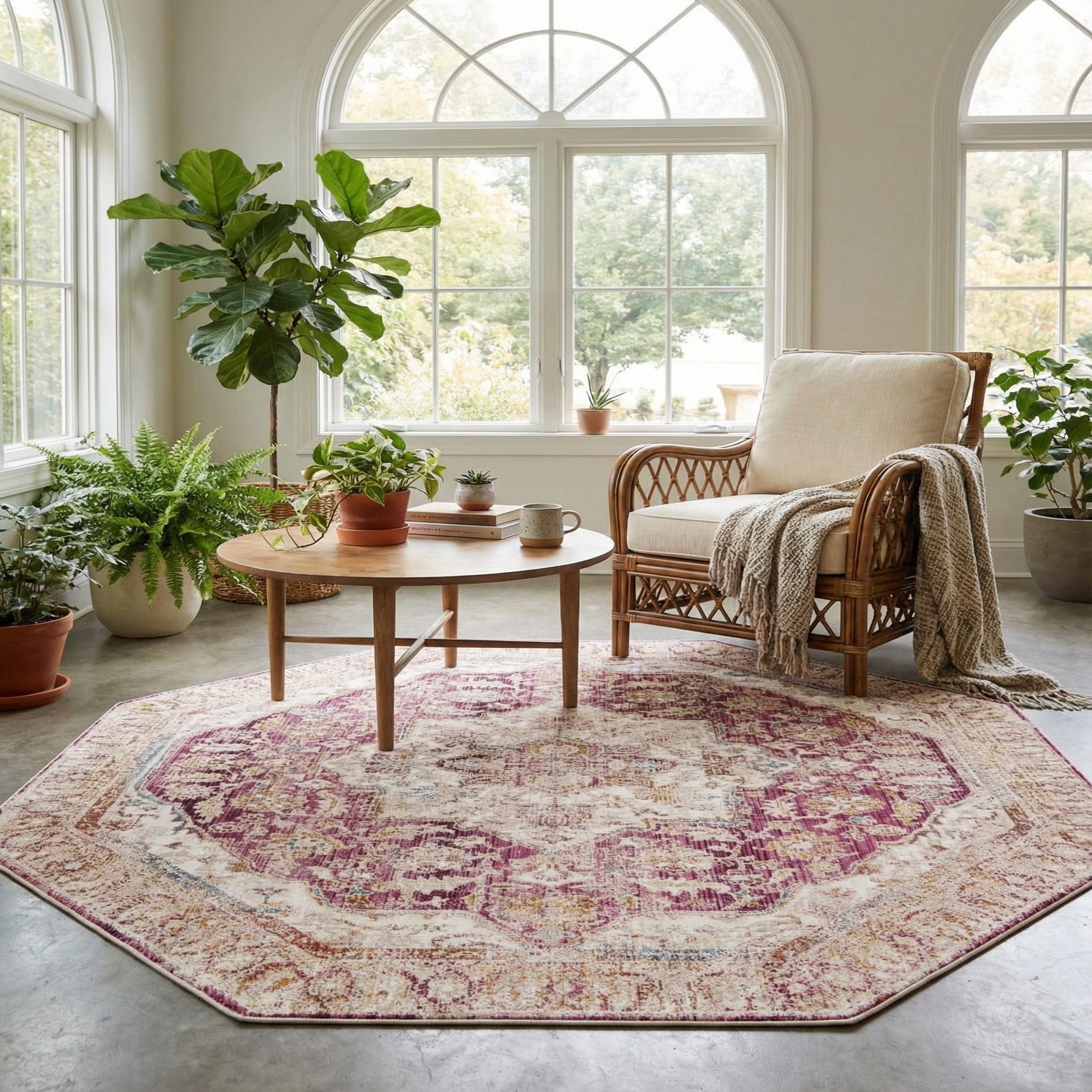Machine?made from 100% polyester, the surface has a low, dense pile with a smooth hand and a mild sheen that catches light softly. The octagon shape and balanced pattern make this piece suited to entryways, seating nooks, or beneath a round dining table where the shape can echo furniture lines. It also pairs well with warm neutrals and gold or brass accents for a transitional look, or with soft grays and muted pastels in a more modern, calming scheme.