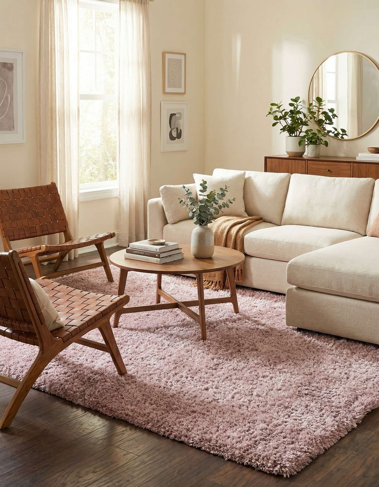 Pair this lavender shag with clean-lined furniture and cool neutrals for a modern bedroom or living room, or layer it under a low-profile sofa to soften a seating area. It also works well in a reading nook, a teen’s room, or a gentle, pastel-themed nursery where a tactile, cozy element is desired. Combine with brass or matte black accents for contrast, or add patterned throw pillows and a woven blanket to bring warmth and visual interest.