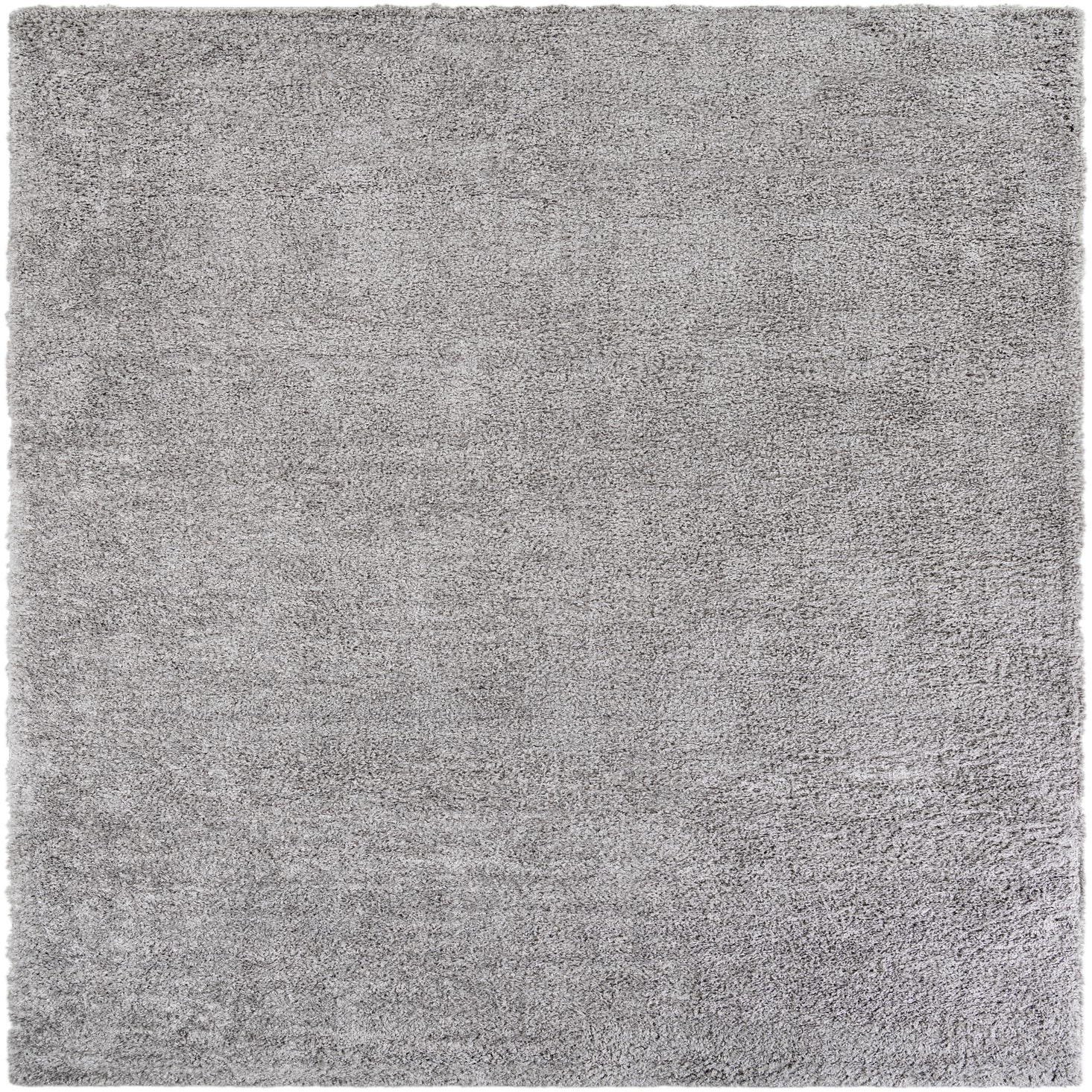 A large 10x13 light grey rectangular shag rug with a soft, textured pile, suitable for a modern living room or bedroom.