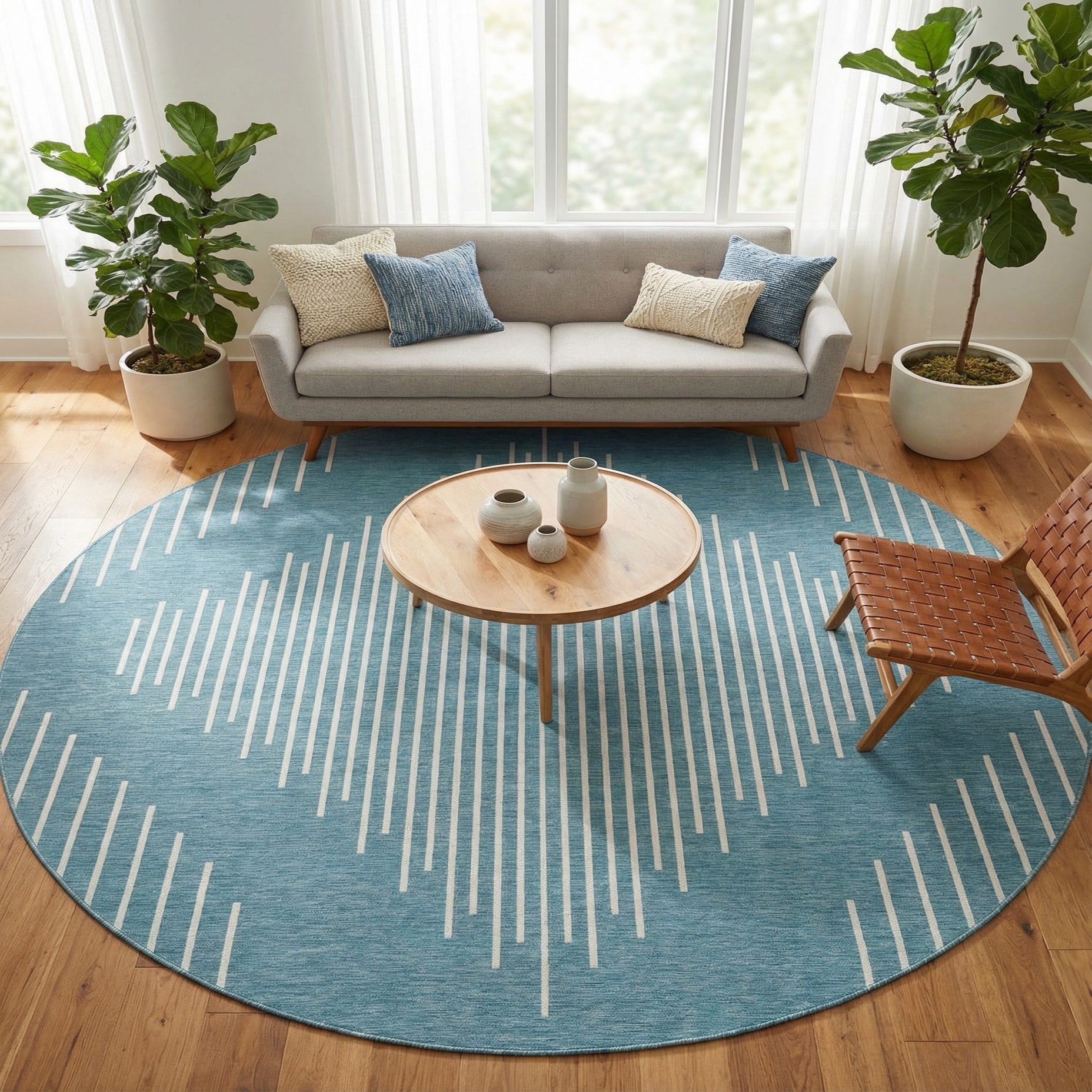 A 10' 8 round Light Aqua outdoor rug with a modern Southwestern stripe pattern, suitable for a patio.