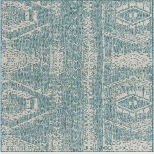 This Outdoor Bohemian collection 12 ft runner is machine-woven of 100% polypropylene, offering both durability and low maintenance. It features a light aqua background with ivory detailing, presenting a relaxed yet on-trend aesthetic. The rug showcases a distressed pattern that gives it a weathered, vintage look, making it a versatile addition to any outdoor space.