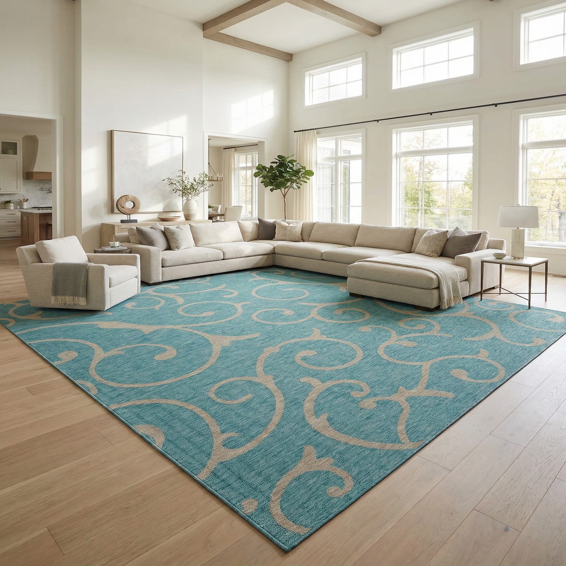 Light aqua square rug with an elegant, swirling botanical pattern in beige, suitable for indoor or outdoor use.