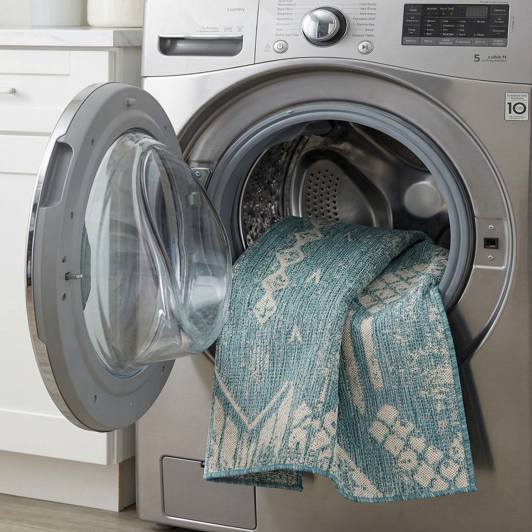 This colorway and pattern work well in coastal, casual bohemian, or modern farmhouse settings. Place it on a covered patio or sunroom to anchor a small seating group, layer it under a bistro table on a balcony, or add a pop of color to an entry or mudroom paired with natural woods, rattan, and linen accents. The light aqua and ivory palette complements soft neutrals as well as coral or warm wood tones for a relaxed, welcoming look.