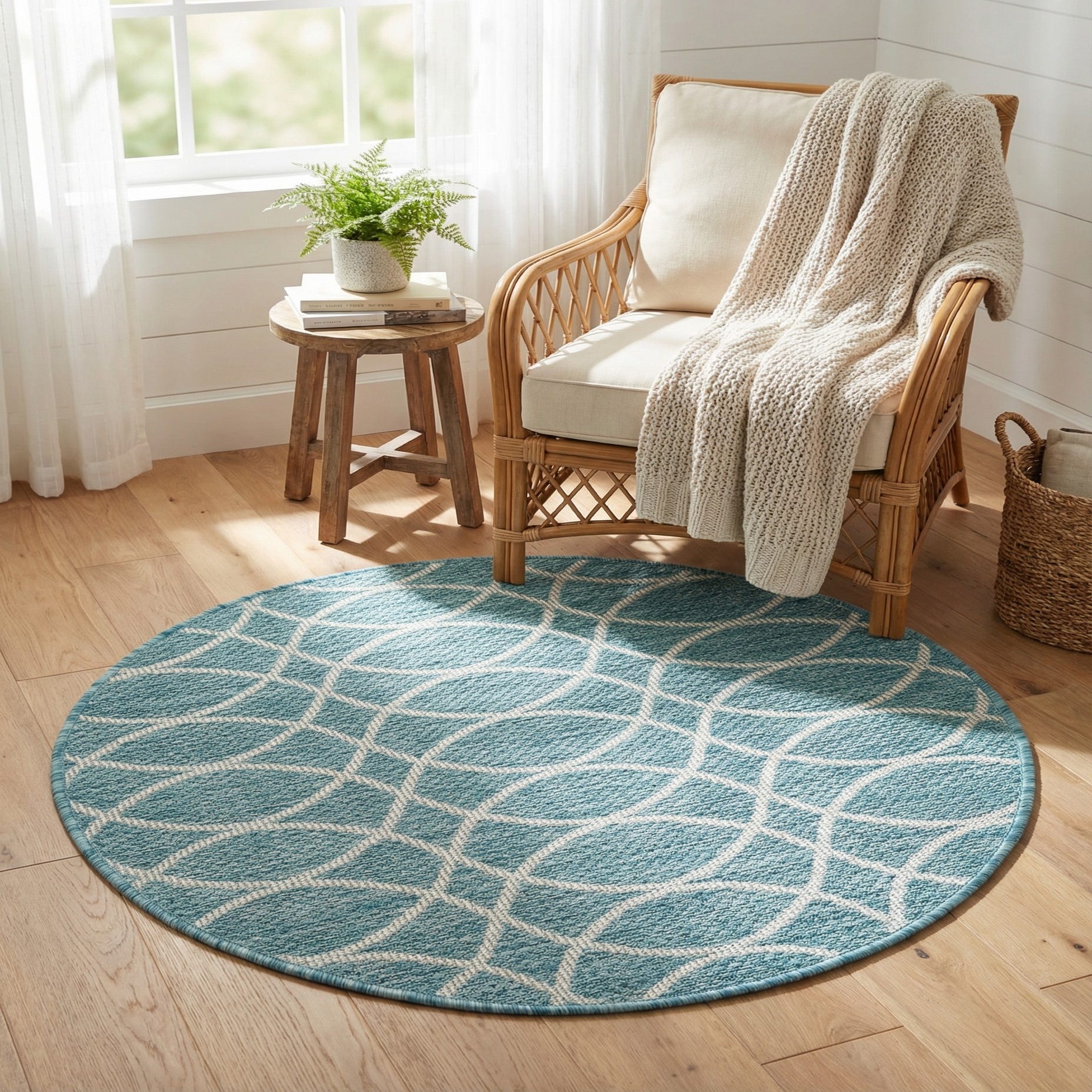 A crisp ivory lattice of interlocking ovals and small diamond motifs sits over a light aqua field, creating a geometric pattern with a subtle organic feel. Machine-made from 100% polypropylene, the rug has a low-profile, tightly woven face that offers a slight textured grain when you run your hand across it. The round shape and neat bound edge give the design a clean silhouette that complements both structured and relaxed layouts.