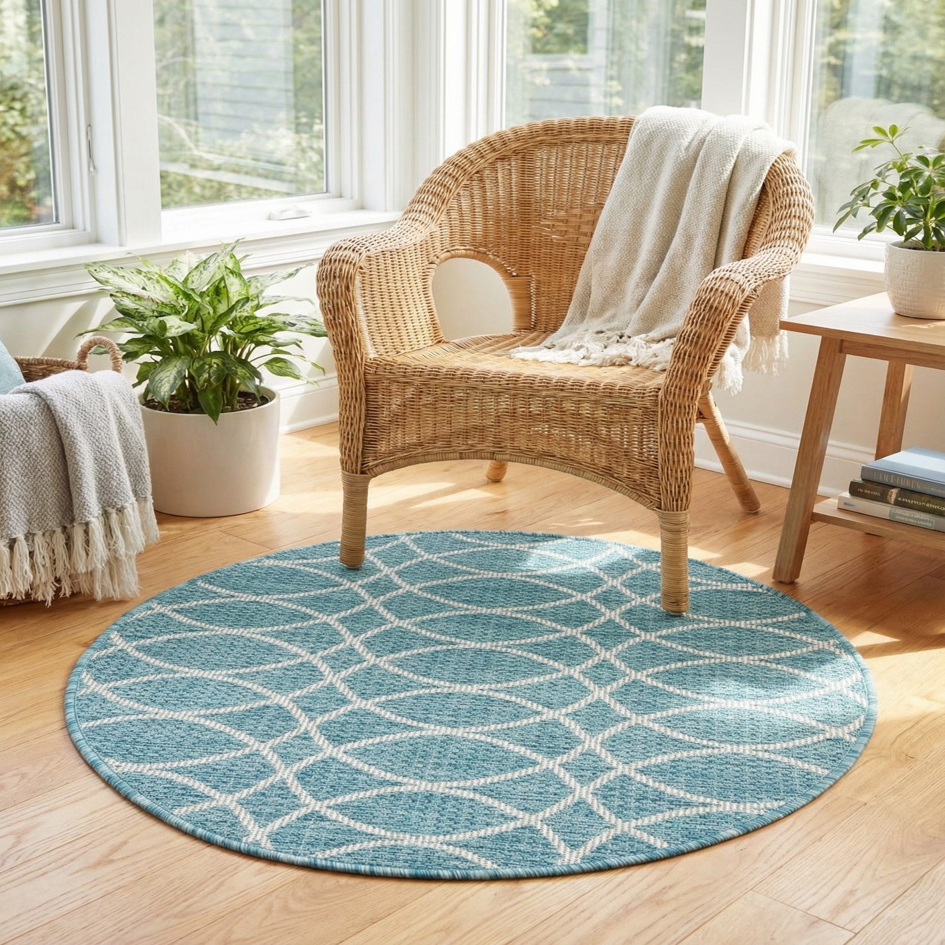 This piece works well outdoors on a balcony or patio, on a screened-in porch, or inside a sunroom where color and pattern bring a fresh focal point. Pair it with natural wicker or teak furniture and navy or sandy accents for a coastal look, or place it beneath a small bistro set or accent chair to define a conversation nook. Its palette and pattern also suit modern and transitional interiors that benefit from a touch of pattern without heavy visual weight.