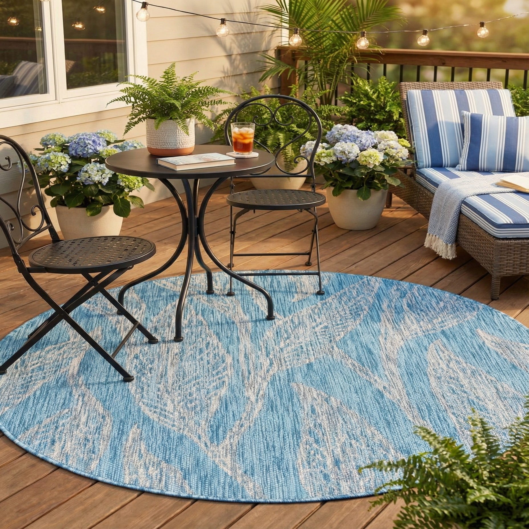 A 4' round light aqua indoor/outdoor rug with a white abstract botanical or leaf pattern, suitable for a patio.