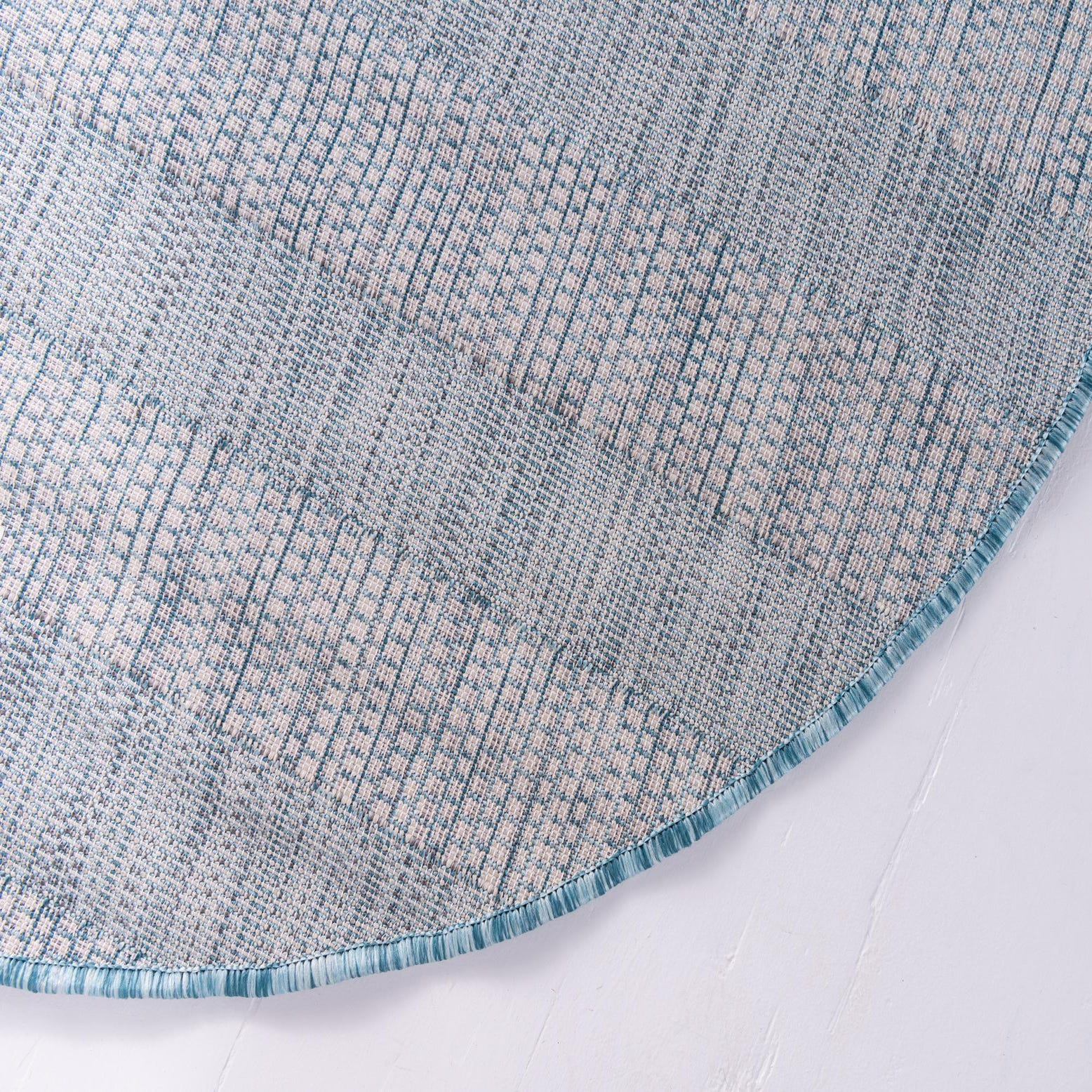 Horizontal ribbon stripes in light aqua and heathered gray create a clean, coastal-inspired look across this round rug. The pattern is formed by a tight, ribbed flatweave that you can feel under your hand—linear texture adds subtle depth while keeping the pile low. Machine-made from 100% polypropylene, the piece has a neat serged edge in matching aqua and a compact, low-profile construction that reads relaxed and modern.