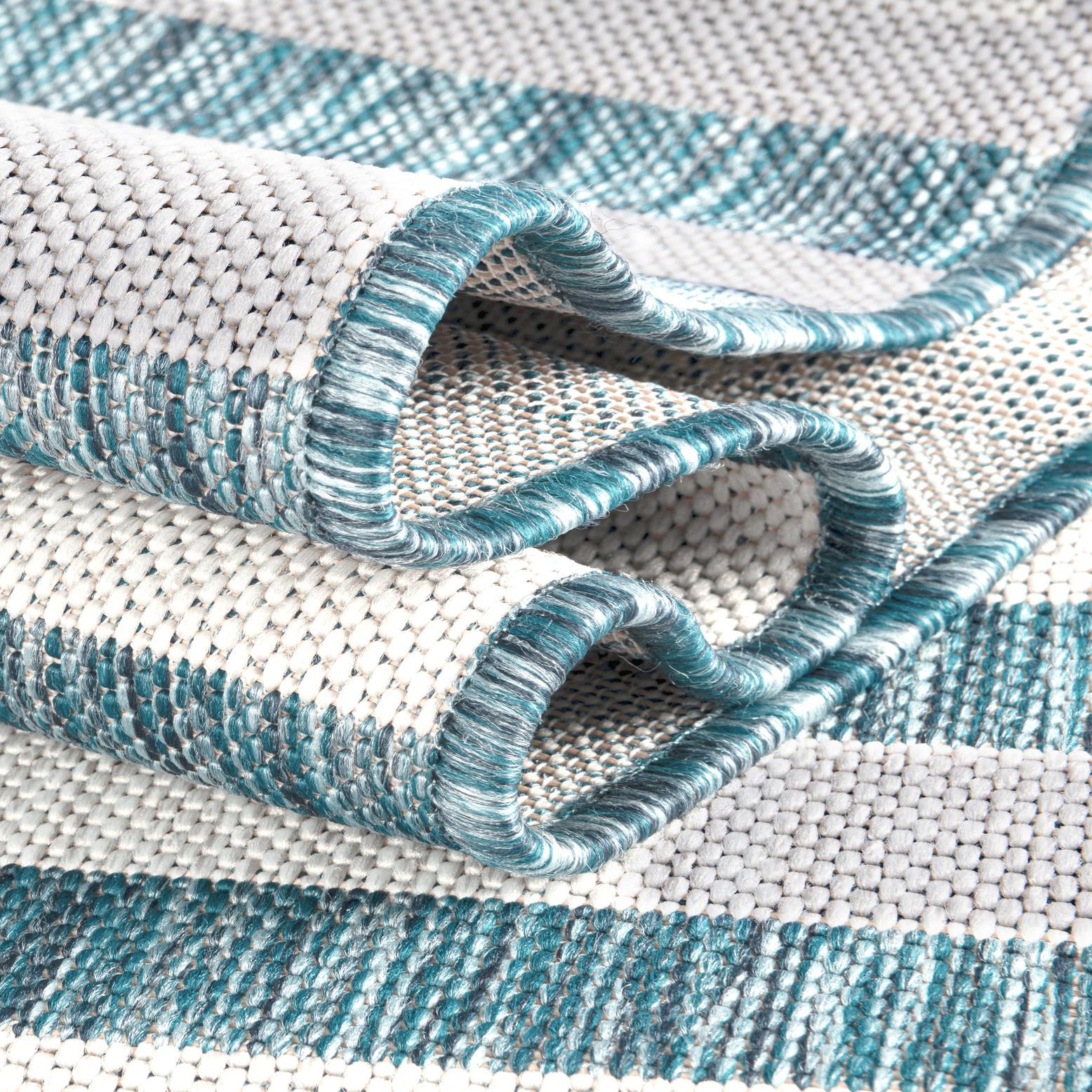 This rug works well in covered outdoor living areas, a sunroom, or a casual dining nook where a crisp, modern coastal look is desired. Pair it with whitewashed wood or teak furniture and linen cushions for a relaxed seaside vibe, or mix with metal and rattan pieces for a contemporary patio setup. It also functions nicely in entryways or mudrooms where a straightforward geometric pattern helps anchor a space.