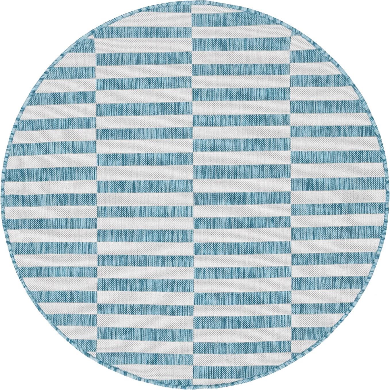 A 4' round indoor/outdoor rug with a modern light aqua and white striped geometric pattern, perfect for a patio.