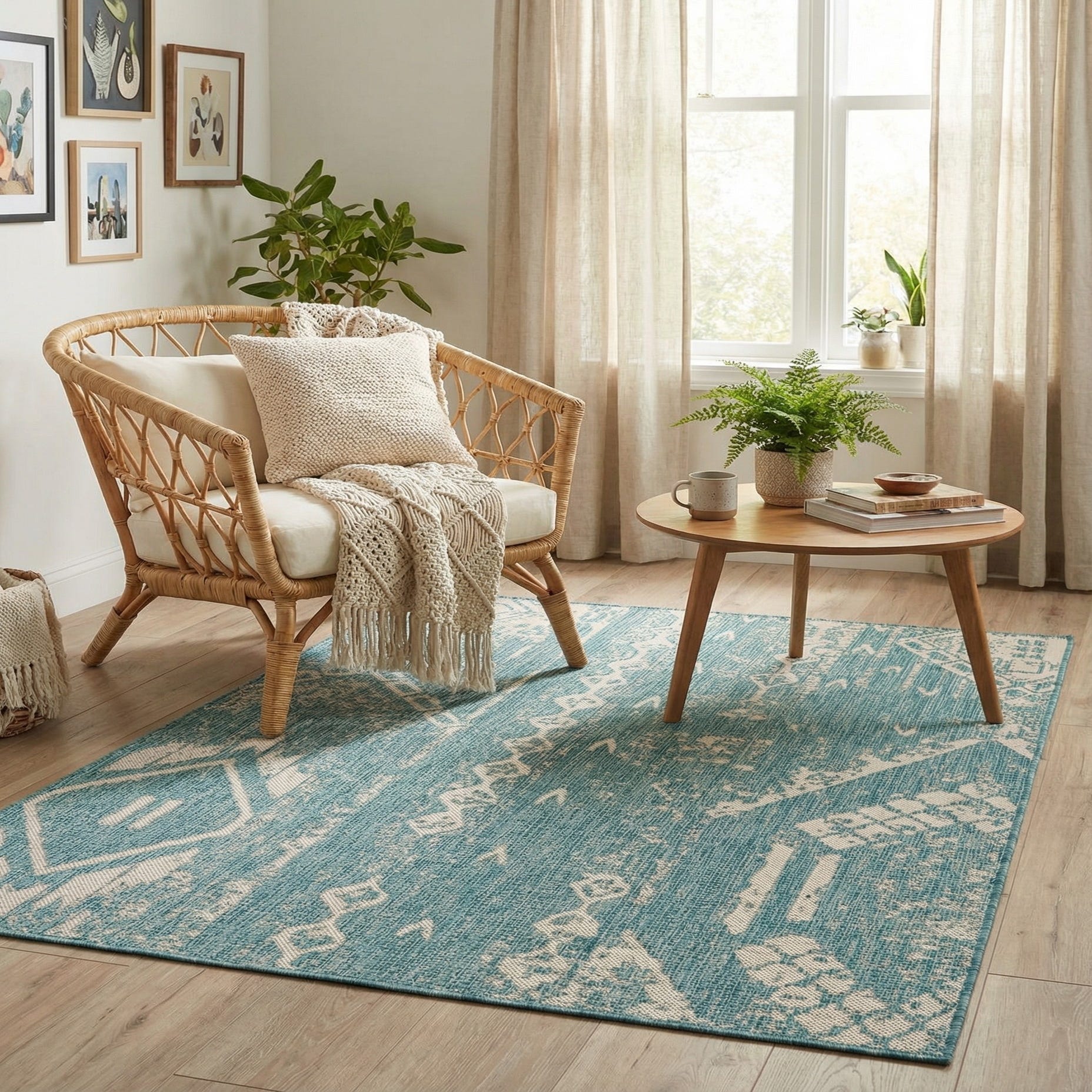 This rug works well indoors or out — place it on a covered porch or sunroom to add color without overpowering a seating group, or use it in a casual living room or dining nook to introduce a coastal-leaning boho vibe. Pair it with natural woven furniture, white or driftwood finishes, and textiles in sandy neutrals or deeper teals for a cohesive, relaxed setting.