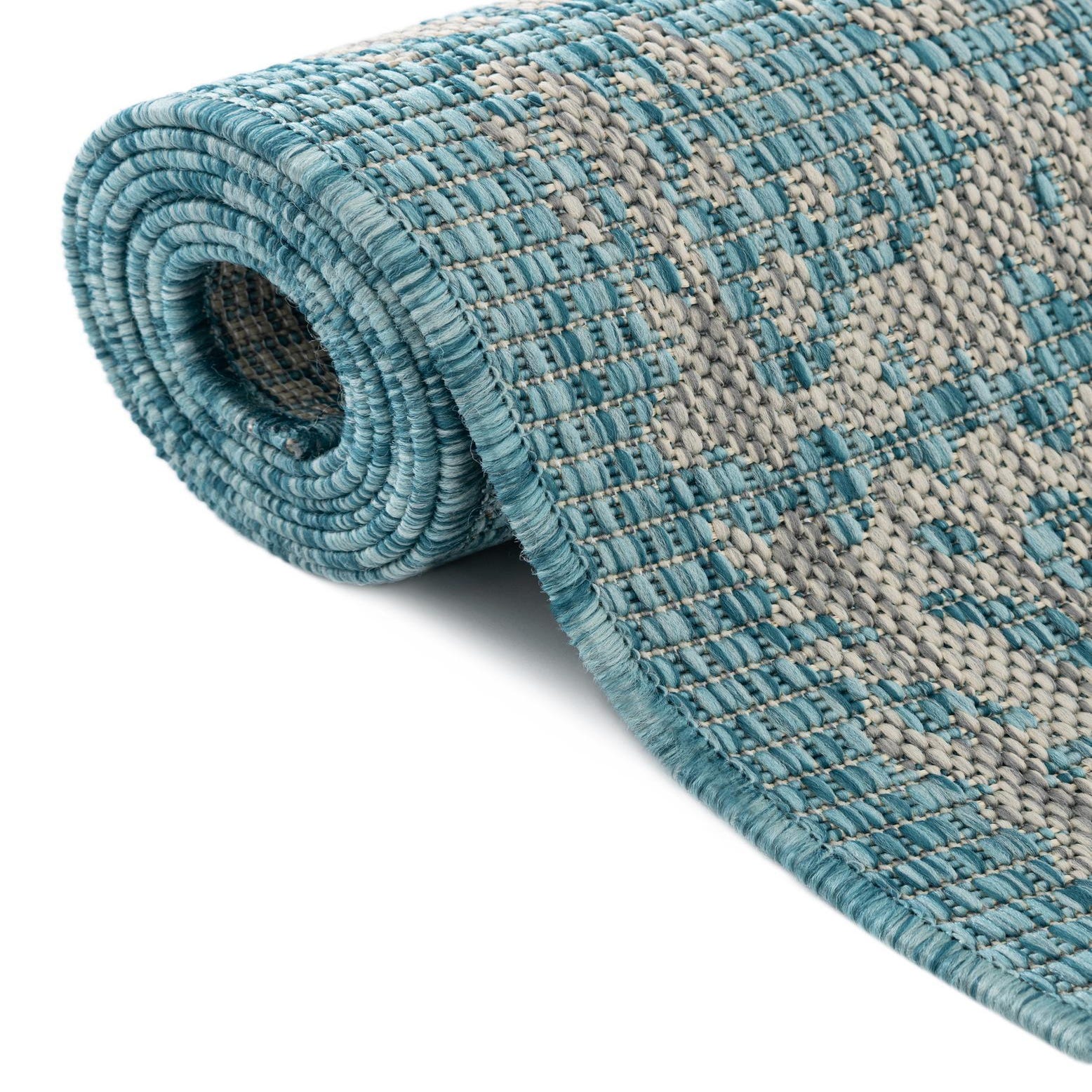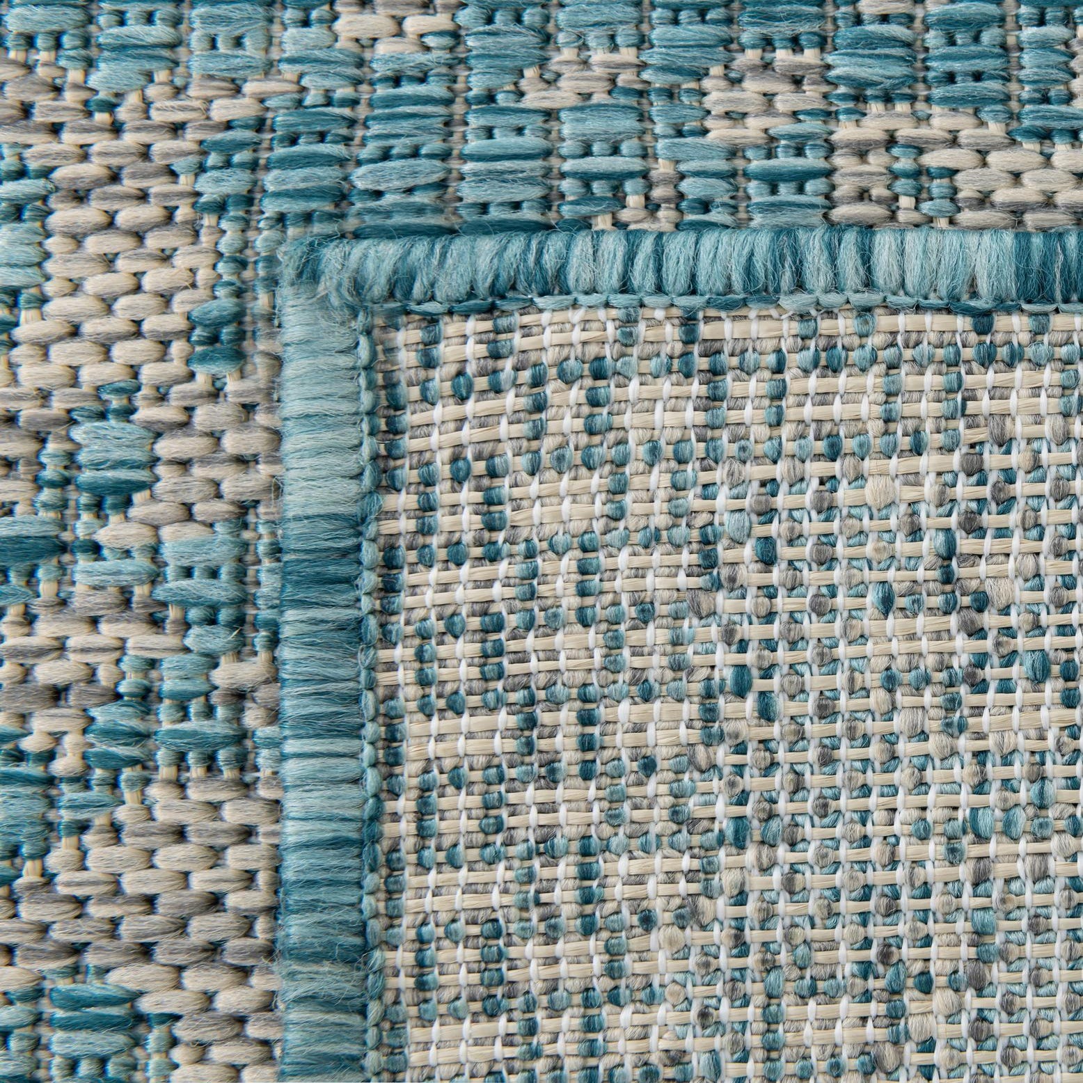 Machine made of 100% polypropylene, the rug has a low-profile, tightly woven texture that feels firm beneath bare feet and shows the woven construction up close. Its balance of color and pattern works well for covered patios, sunrooms, or casual living spaces, and pairs nicely with coastal, cottage, or modern farmhouse decor. Use it under a bistro table, in front of an outdoor seating area, or layered with larger indoor rugs to introduce a soft aqua accent without overwhelming the room.