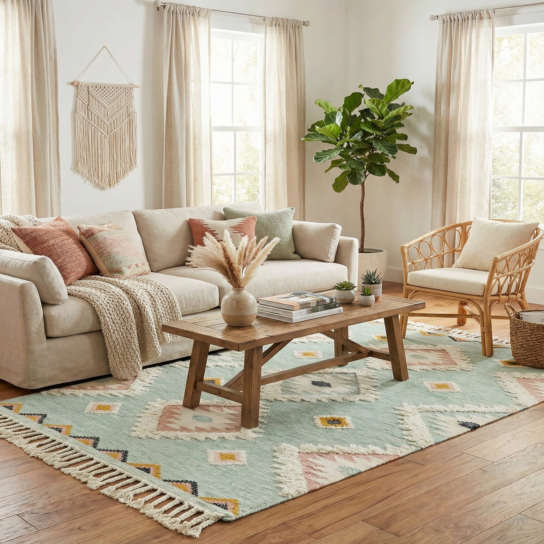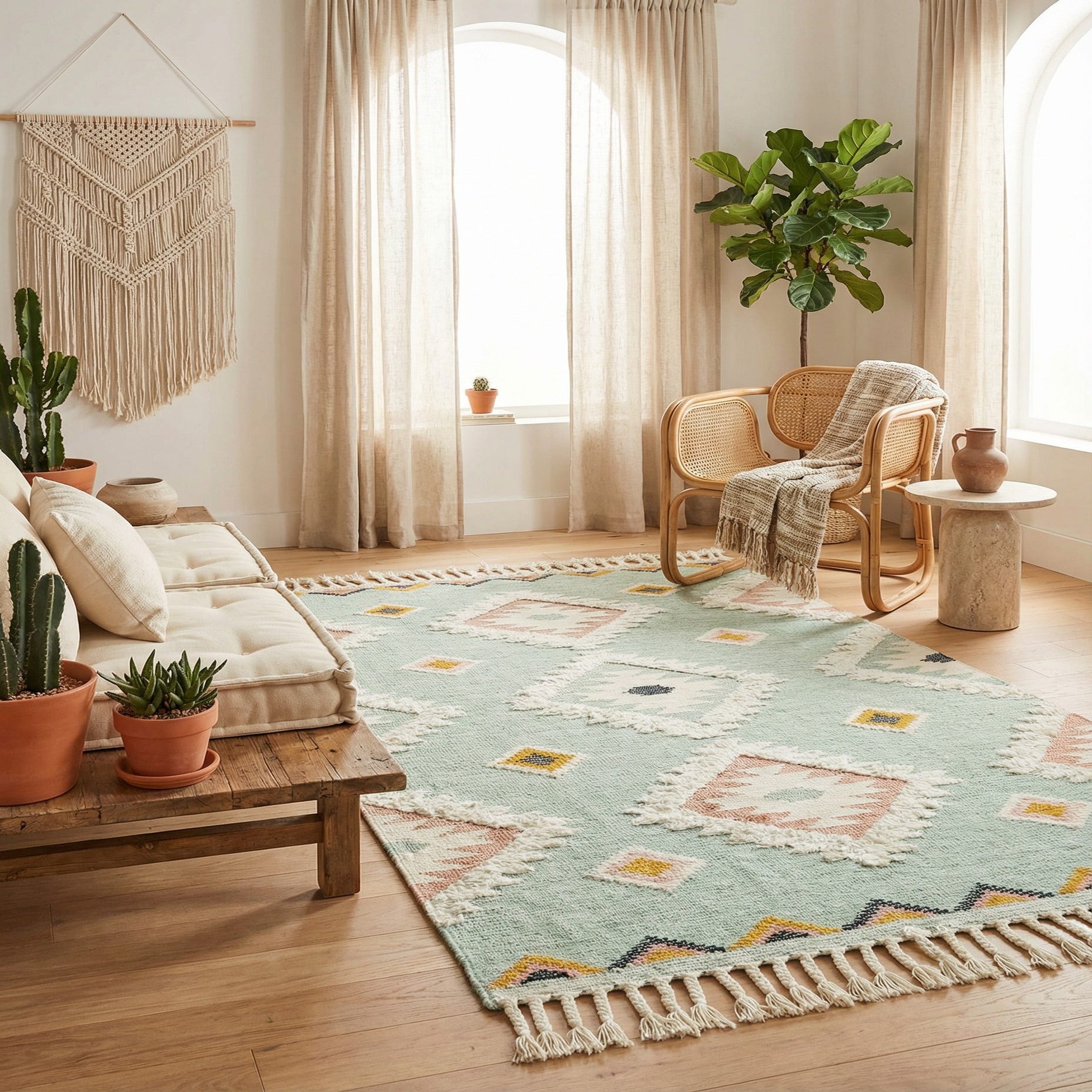 Hand woven from 100% wool, the construction combines a predominantly flat weave with raised tufted details around the larger diamonds, giving a subtle, tactile contrast underfoot. The wool surface has a comfortable, natural feel and the low-profile base keeps the rug steady while the tufted accents add visual depth. Pair this piece with light wood or white-painted furniture for a coastal or cottage setting, layer it in a relaxed bohemian living room, or use it to brighten a bedroom or sunroom — it also works well with mid-century modern pieces when you want to introduce a soft, patterned focal point.