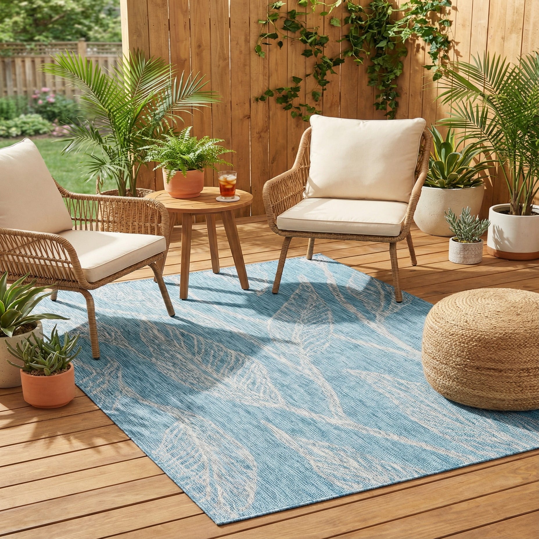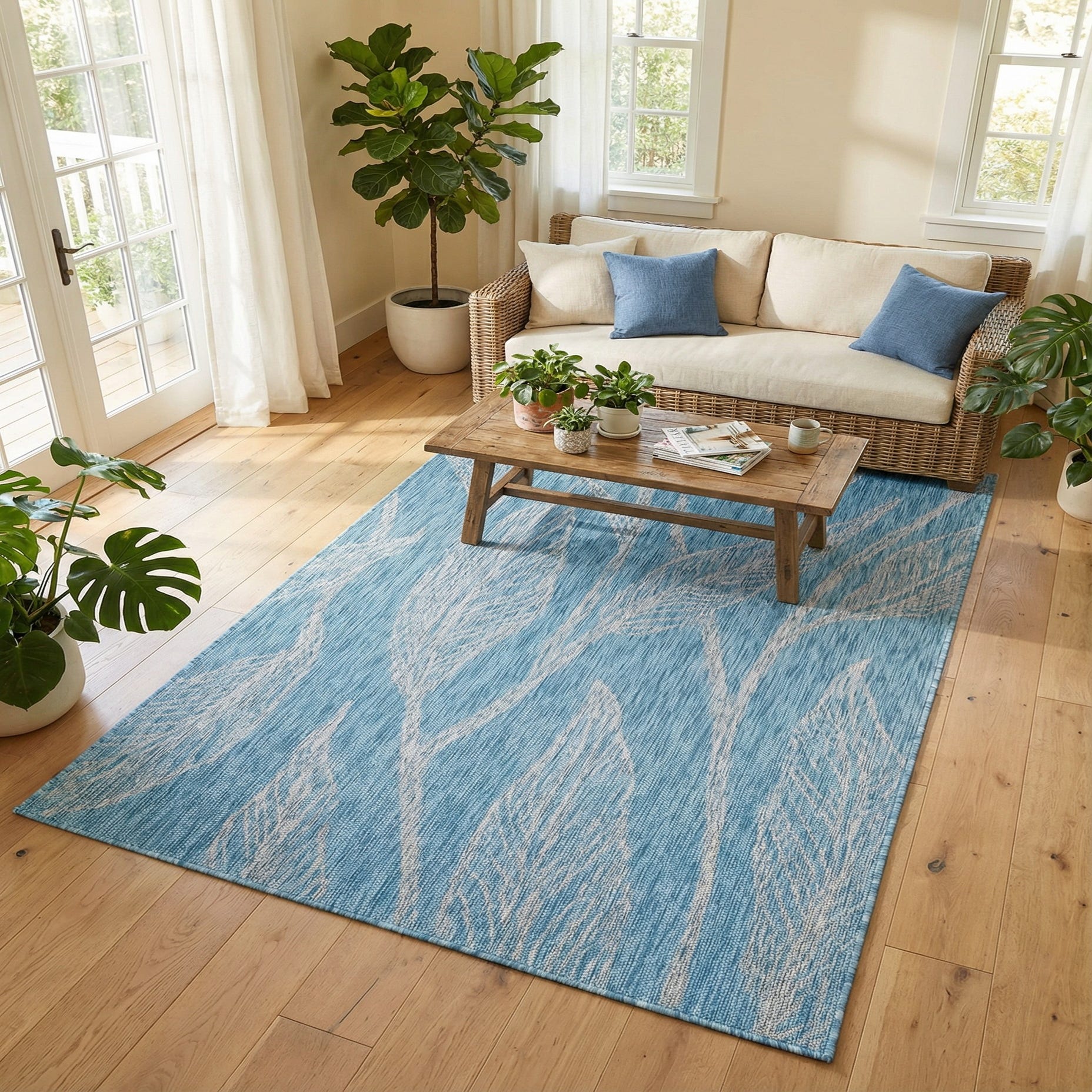 Place this piece on a covered patio or sunroom to reinforce a coastal or garden-inspired scheme, or use it under a casual dining set or seating group to introduce a fresh pop of color in a contemporary living space. It pairs naturally with weathered woods, white or gray furnishings, and woven textures for relaxed, transitional styling, and works equally well on a balcony, poolside lounge, or entry that benefits from a durable, decorative anchor.
