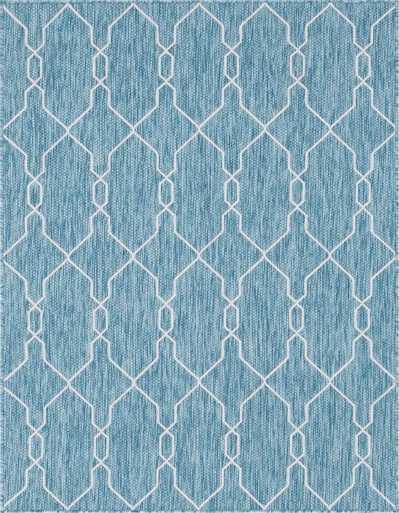 The Outdoor Lattice collection offers a 5x8 machine-woven rug made of 100% polypropylene that provides durability and longevity. This particular rug displays a harmonious light aqua background complemented by a crisp ivory pattern. The lattice design presents a contemporary take on geometric style, granting it a versatile visual appeal.