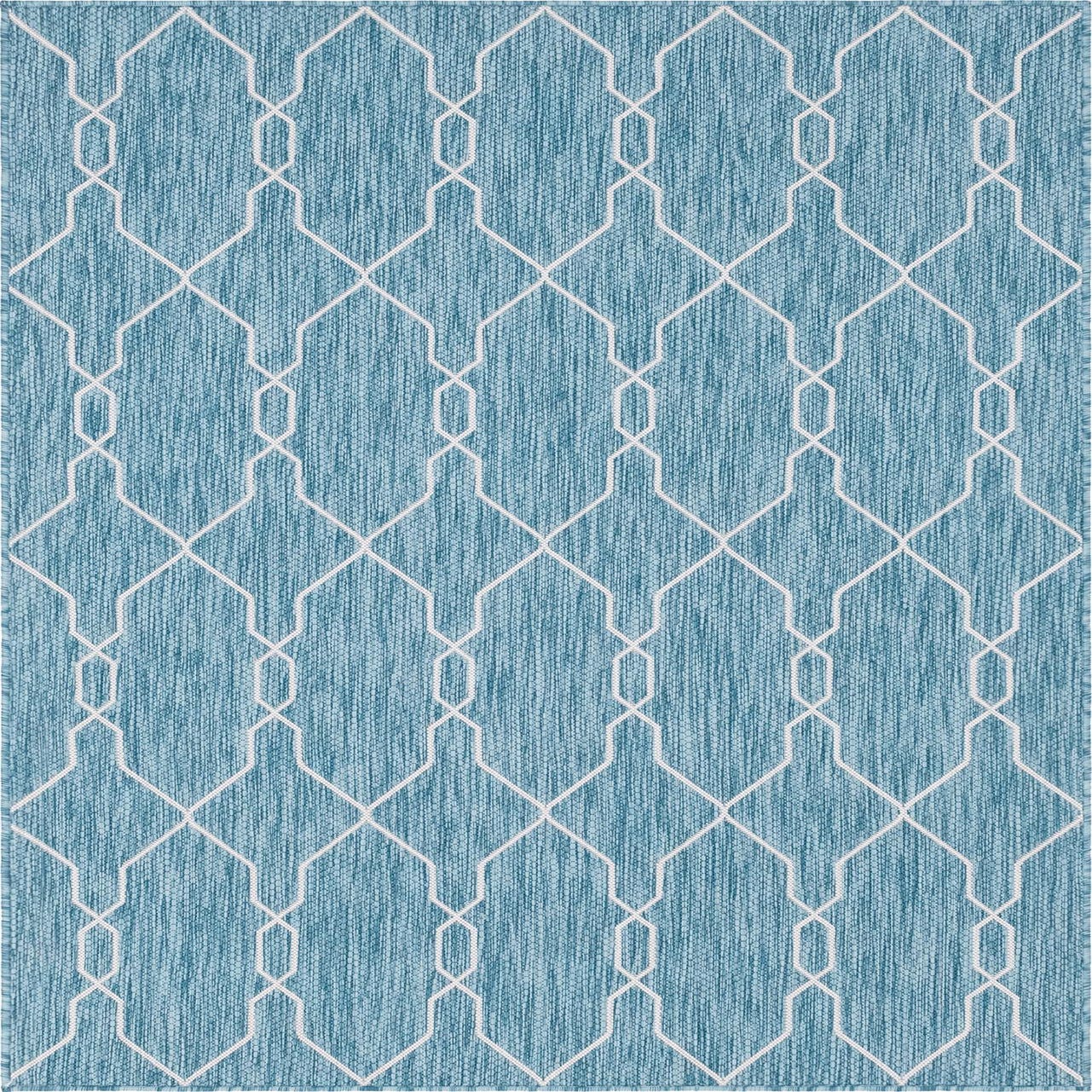 In terms of interior design, this rug would work best in spaces that embrace a modern or coastal aesthetic, given its refreshing color palette. It can serve as a subtle statement piece in minimalist environments or blend seamlessly with more vibrant decor elements. Whether placed on a patio, poolside, in a living room, or dining area, the Outdoor Lattice rug can harmonize with various design scenarios while providing a touch of elegance and functionality.