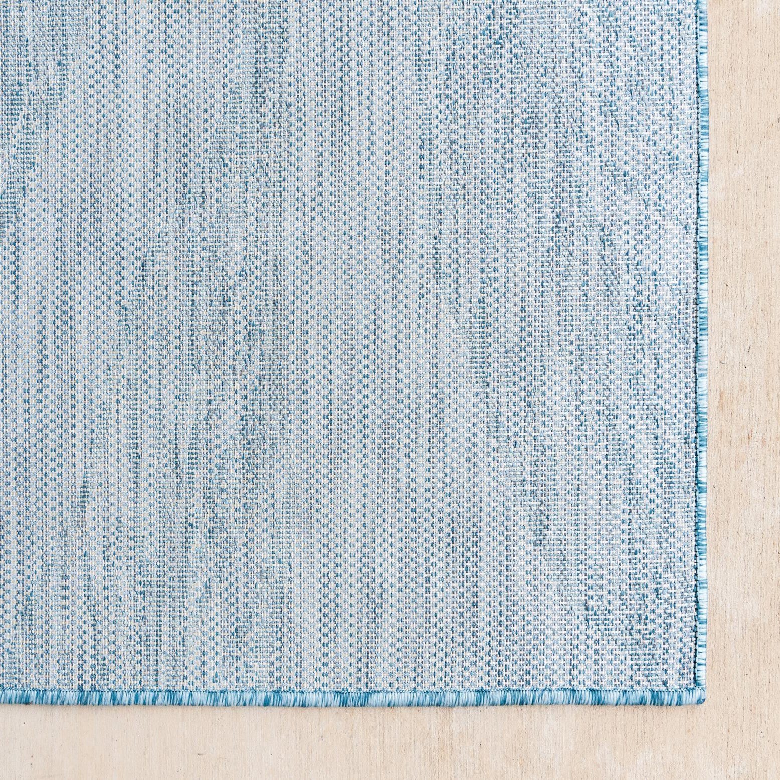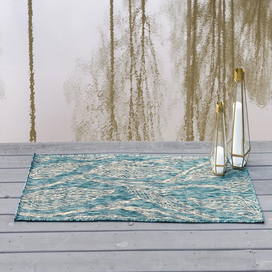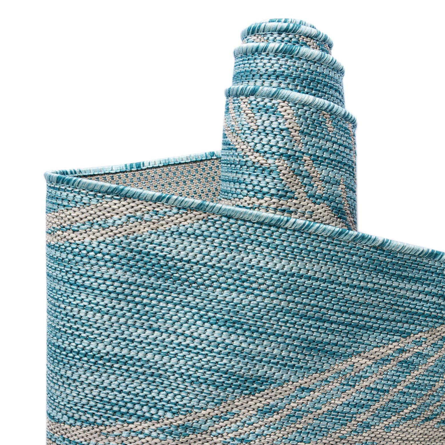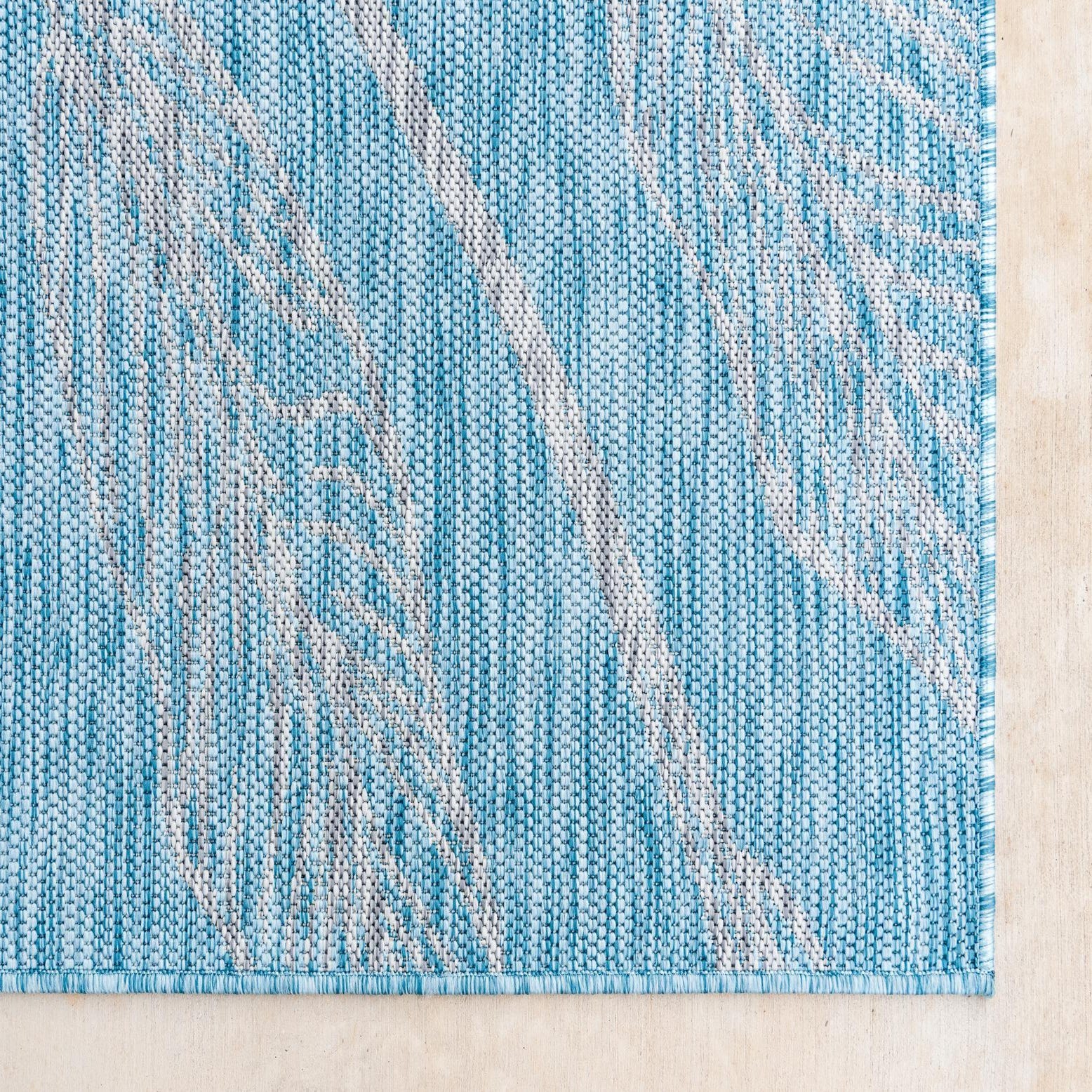 A 6 ft runner rug in light aqua with a modern botanical leaf pattern, suitable for indoor/outdoor use.