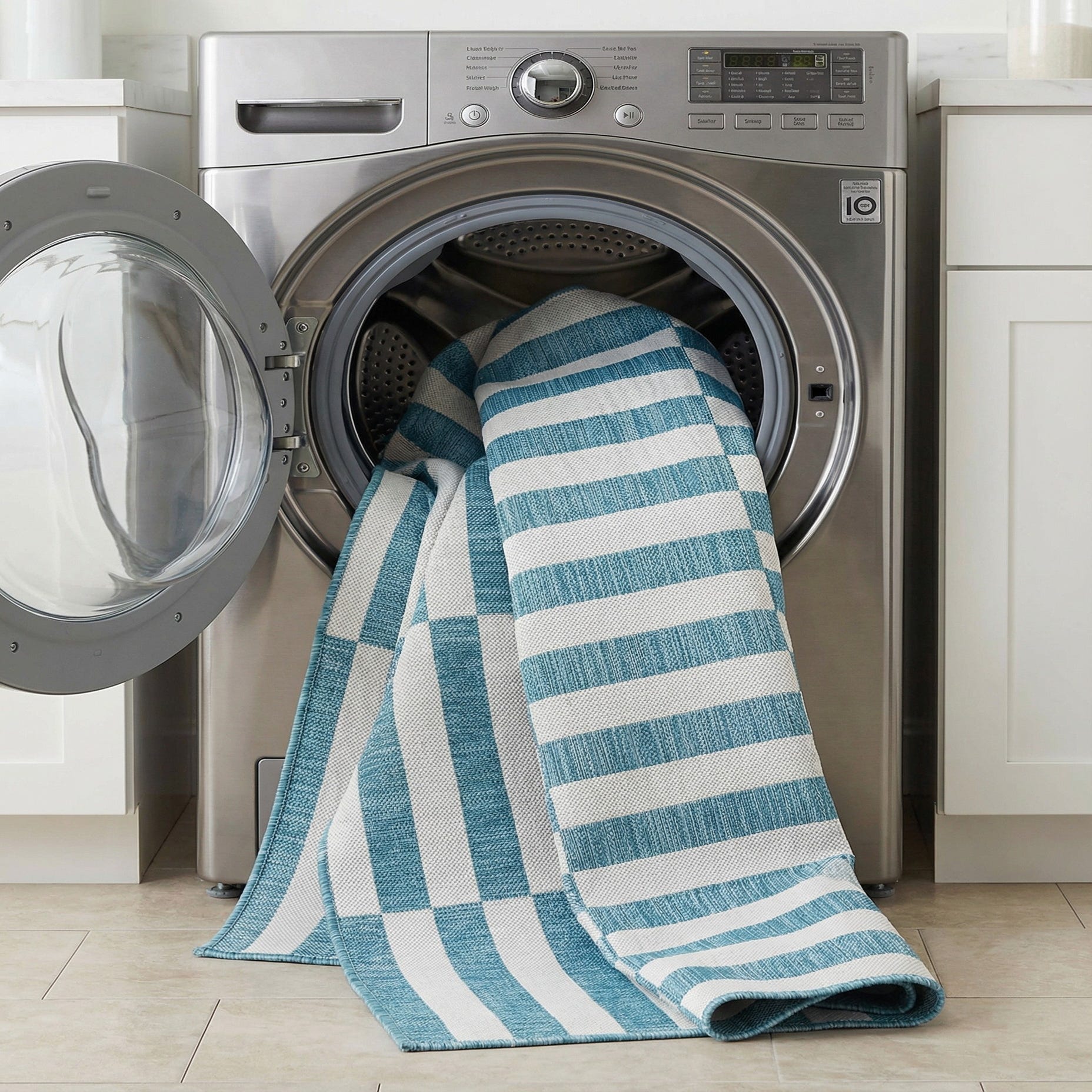 Machine made from 100% polypropylene, this piece fits naturally into coastal, contemporary, or transitional settings. Place it under a casual dining table on a covered patio, anchor a breezy sunroom with wicker and pale wood accents, or use it to define a seating area in a modern living space where crisp color and easy layering are desired. It also pairs well with linen textiles, white or natural-wood furniture, and accents in deeper aqua or navy for a pulled-together palette.