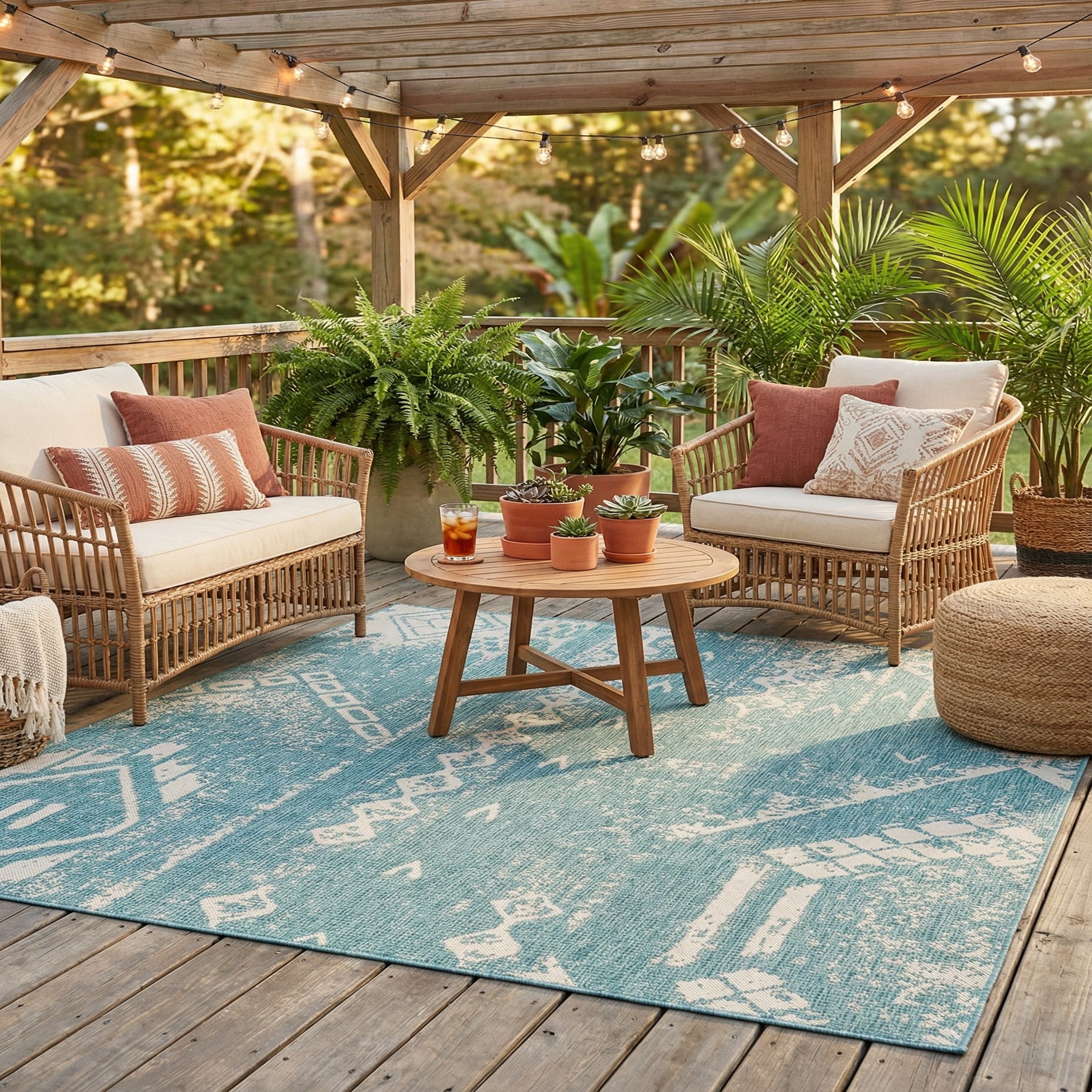The refreshing color palette of light aqua and ivory can seamlessly integrate with coastal, contemporary, or bohemian-styled decors. This rug can effortlessly anchor a casual outdoor seating area, bring a calm hue to a bright sunroom, or define a space in an open-floor-plan interior. The design's adaptability and resilience make it a practical yet stylish foundation for various living spaces.