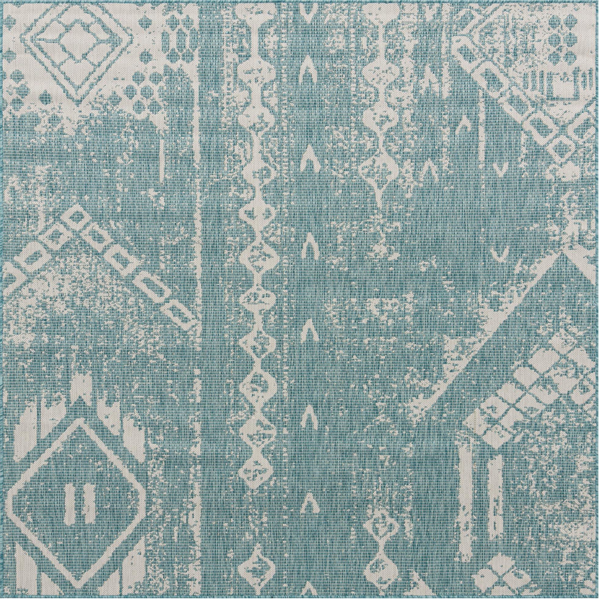 This Outdoor Bohemian Collection rug presents a modern take on traditional design, offering a tasteful and versatile square 7-foot rug that complements various outdoor and indoor living spaces. It features a light aqua backdrop interplayed with an ivory bohemian pattern, providing a laid-back, yet stylish vibe. The machine-woven 100% polypropylene construction ensures durability and ease of maintenance.
