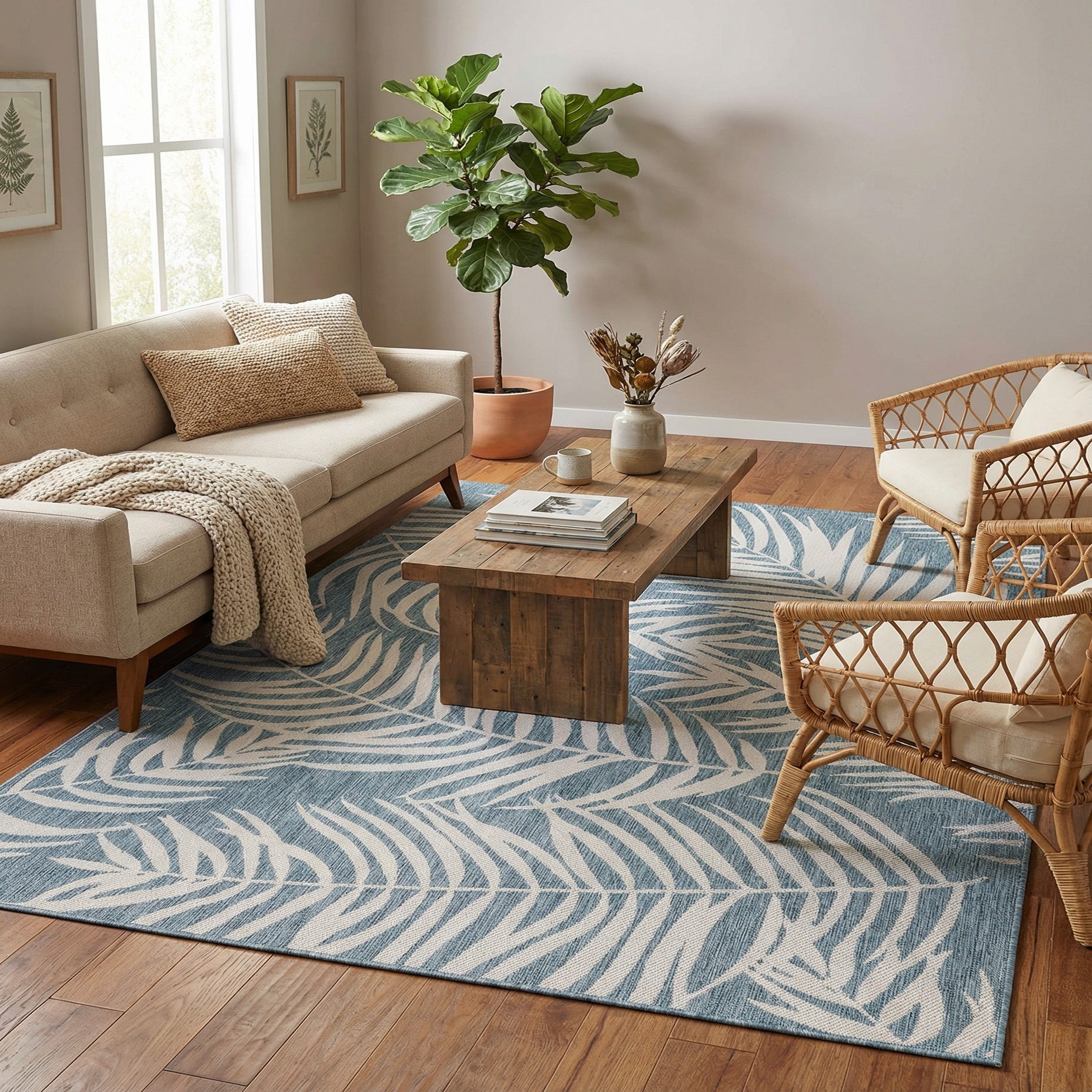 Machine made from 100% polypropylene, this rug is built for everyday use in both covered outdoor areas and high-traffic indoor spaces. It fits naturally in coastal, modern tropical, or casual contemporary schemes—pair it with wicker or rattan seating, teak furniture and crisp white accents for a breezy patio setup, or use it to anchor a sunroom, screened porch, or kitchen dining nook for an easygoing splash of color and pattern.