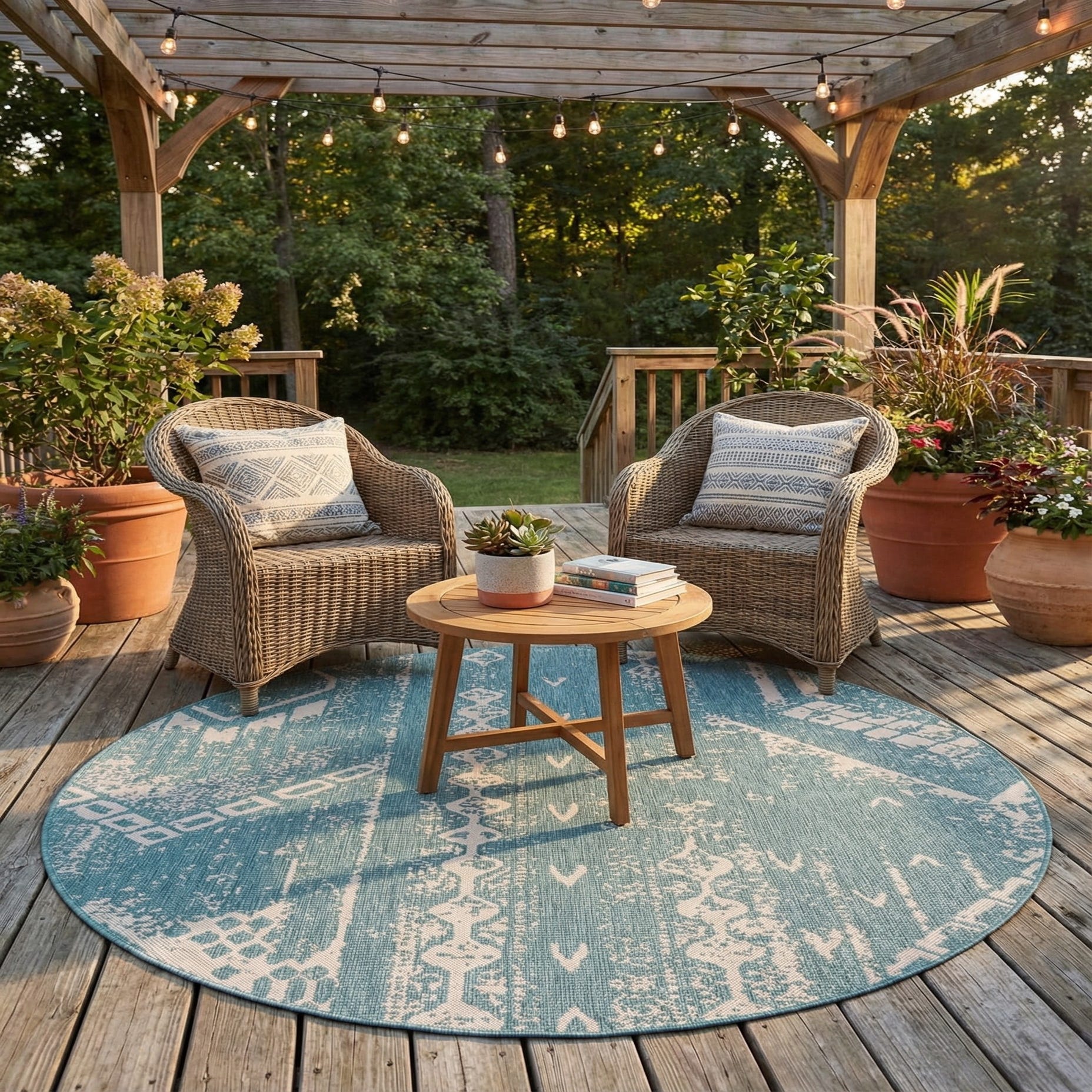 The Outdoor Bohemian 8 Ft Round rug features a tasteful Light Aqua background complemented by Ivory accents in a dynamic pattern that imparts a casual yet sophisticated bohemian charm. Drawing from a palette that evokes the serenity of tranquil waters and the purity of ivory sands, this rug effortlessly harmonizes with a variety of outdoor and indoor settings.