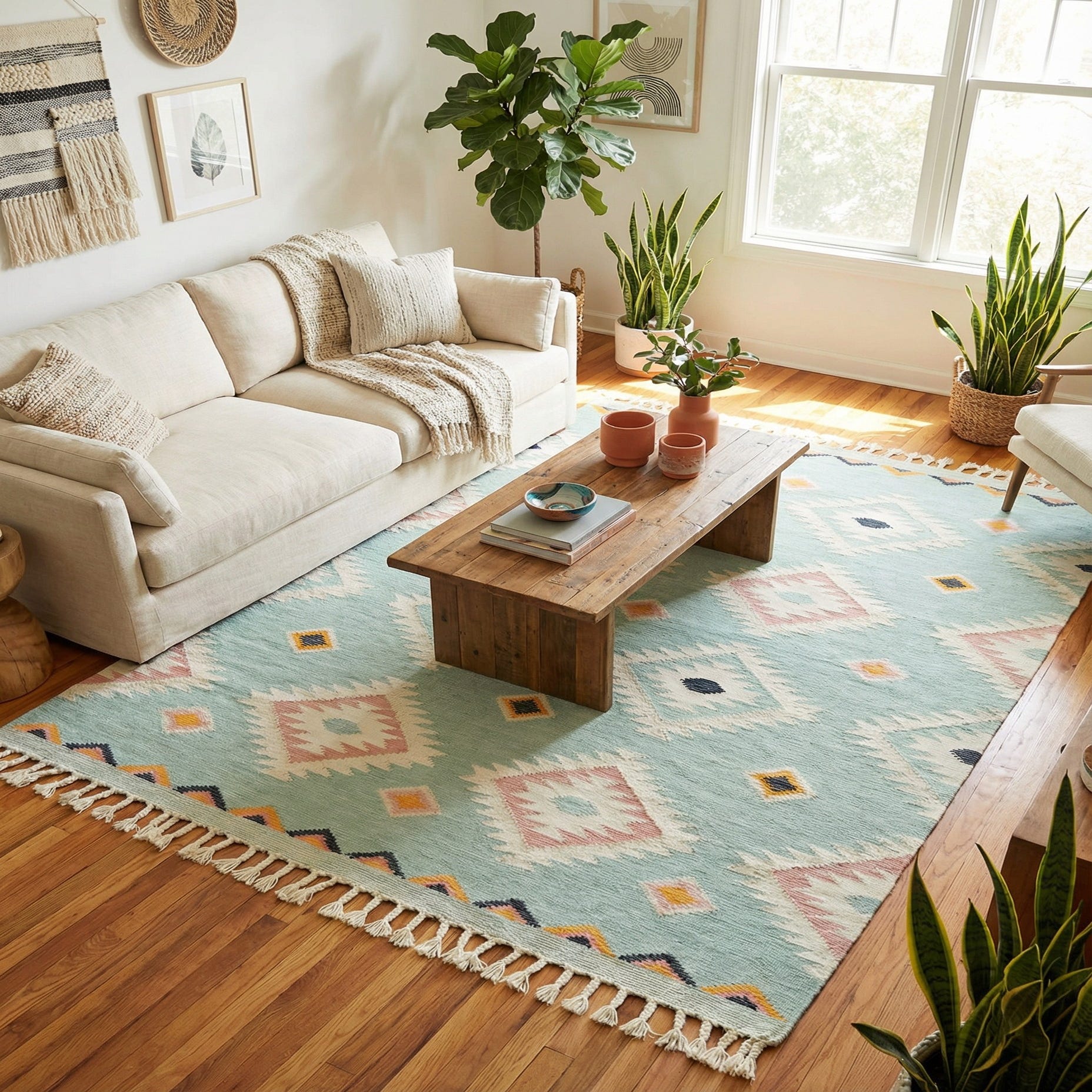 Hand woven of 100% wool, this rug has a light aqua ground punctuated by ivory stepped-diamond medallions and smaller lozenge motifs in gold, salmon and navy blue. The geometric, Southwestern-inspired pattern is evenly balanced across the field, with crisp ivory outlines and pops of navy at the center of key diamonds. The handwoven construction produces a low, textured weave that feels warm and slightly springy underfoot, while the tasseled ends add a casual, handcrafted finish.
