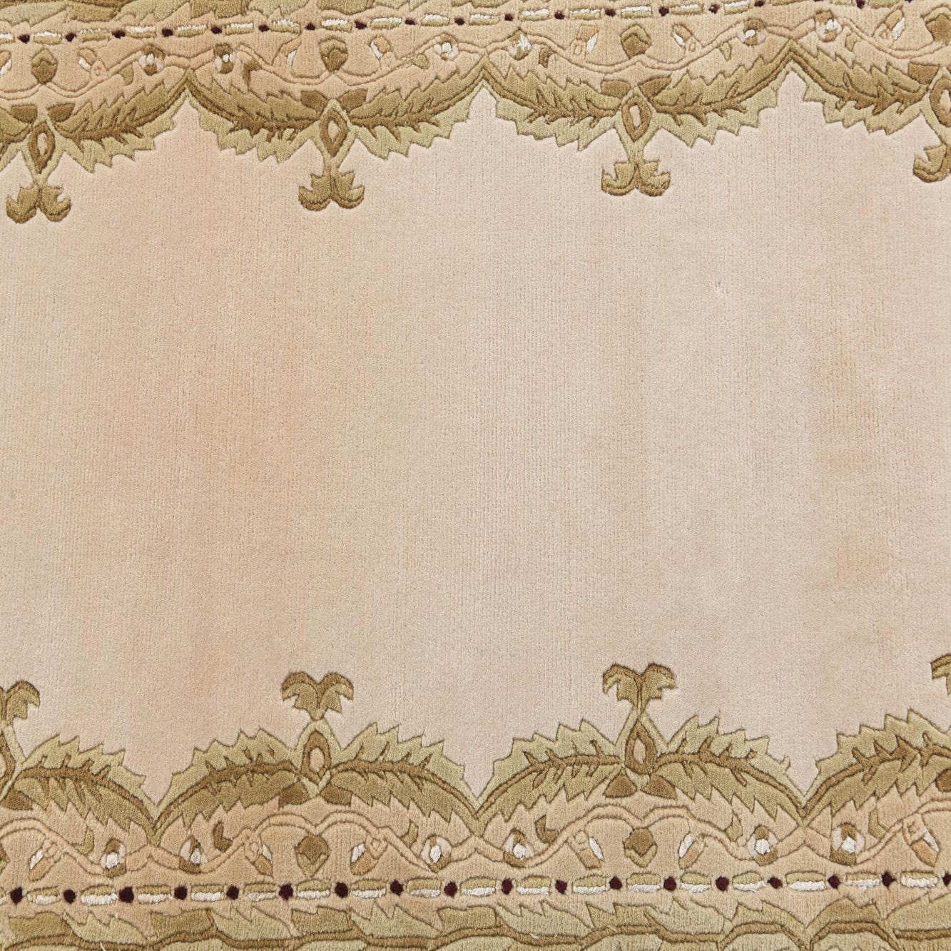 The rug's design features a Light Beige background, creating a subtle base that allows the detailed borders to stand out. These borders are adorned with intricate patterns combining Green, Light Green, and Maroon accents, which lend a sense of classic elegance to the rug. The ornate leaf motifs and decorative elements along the edges create a sophisticated frame for the expansive central beige expanse.