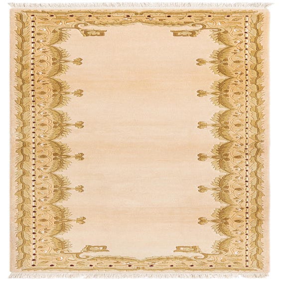 A 10 ft Darya runner rug in ivory with a detailed modern oriental border pattern in gold and cream, handmade from wool.