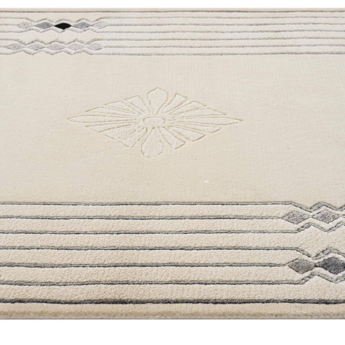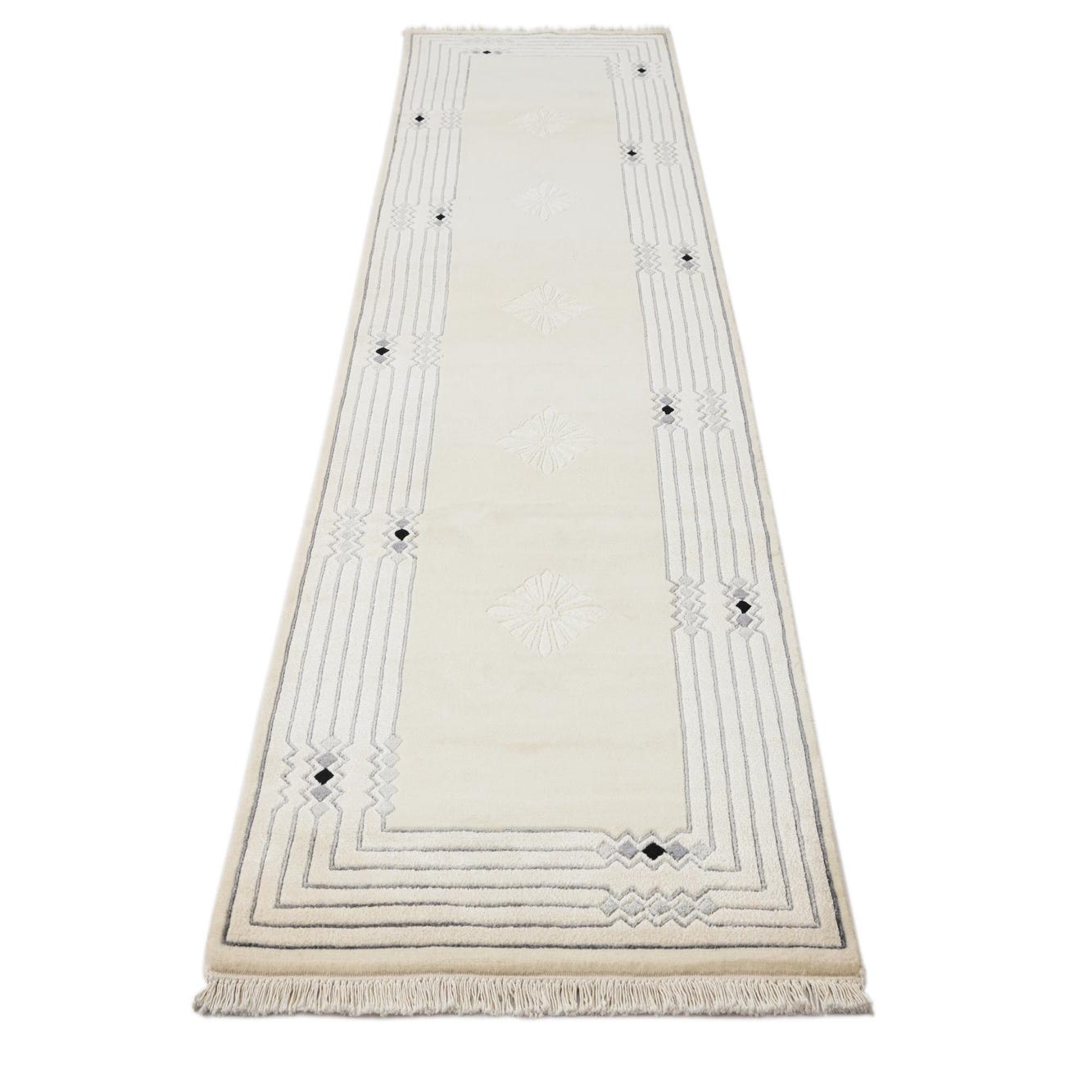 A 10 ft runner rug in ivory with a modern Oriental pattern, featuring gray geometric borders and subtle floral motifs.